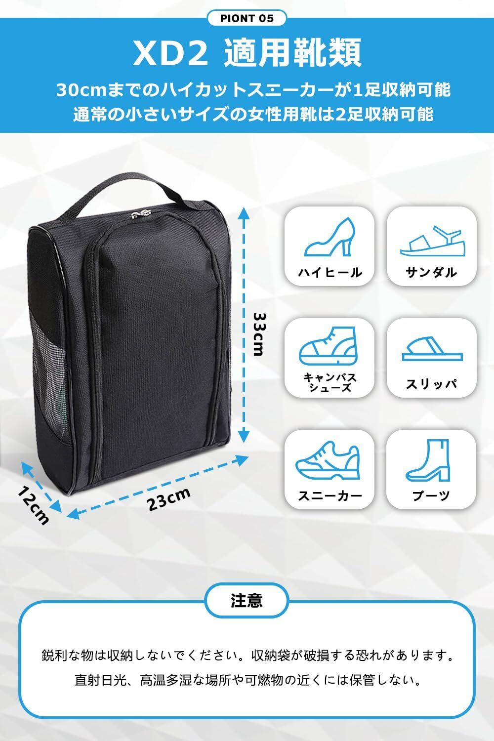 【XD2|日本国内で丁寧に検品|創業40年の専門工場で製造】当社の製品はすべて、日本国内にて一つ一つ丁寧に検品を行い、万全の状態でお客様にお届けできるよう、徹底した品質管理を行っております。靴収納袋の製造を中心に、創業以来40年以上にわたり培ってきた高い技術力と豊富な経験を活かし、安定した品質の商品をお届けしていま。また、ご購入日から1年間のメーカー保証をお付けしており、通常使用による不具合にも迅速に対応いたしますので、安心してご利用いただけます。商品内容物:靴収納袋 ×1、日本語取扱説明書 ×1。