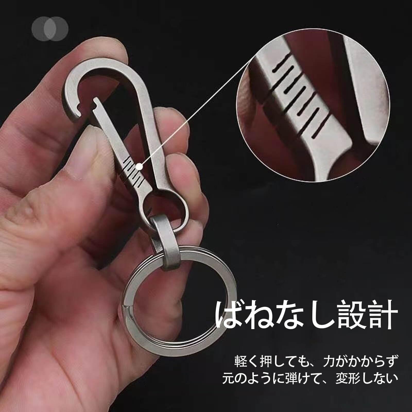 【チタンの一体構造】バネを使用せずチタンの高弾性を利用したつなぎ目のないオールチタン合金製のシームレスな一体構造鍵の着脱もワンタッチで楽々ですカギの紛失・脱落防止におすすめです。