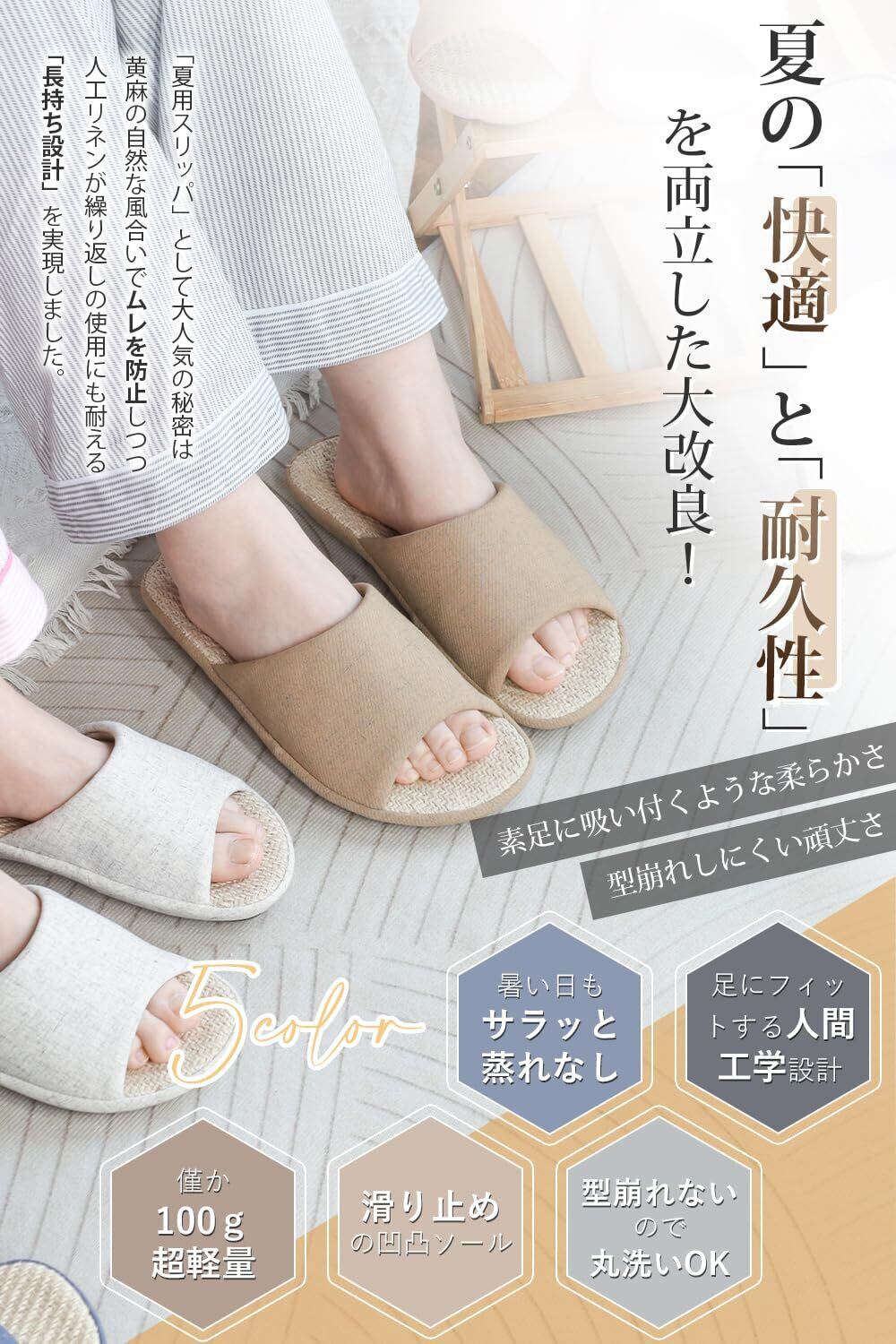 【大改良!天然黄麻×亜麻、快適性と耐久性両立の夏用スリッパ】天然ジュート(黄麻)の柔らかさと亜麻の耐久性を融合したハイブリッド素材を採用。天然黄麻素材は、快適性に優れ、耐久性に劣るという点がある。一方、リネン素材は耐久性に優れ、快適性に劣る。そこで、この2つの長所を組み合わせた新しいスリッパが誕生した!ムレにくく通気性抜群で、夏の暑い日でもサラッと快適に。
