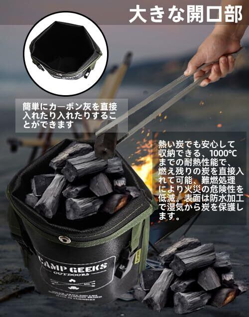 【ガラス繊維製 × 耐熱・難燃・防水】耐火性のあるガラス繊維素材を採用。耐熱性・難燃性が高く、熱い炭でも安心して収納できる、200℃までの耐熱性能で、燃え残りの炭を直接入れて可能、難燃処理により火災の危険性を低減。表面は防水加工で湿気から炭を保護します。