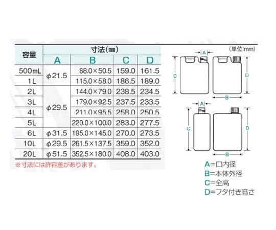 【仕様】容量:4L、寸法:口内径φ29.5mm、本体外径211×95.5mm,フタ無高258mm(フタ付高250.5mm)材質:本体/ポリエチレン(HDPE)、キャップ/ポリプロピレン(PP)、中栓/リニアポリエチレン(LLDPE)使用温度範囲:0~70℃持ちやすい取手付き大型容器で保存・持ち運びに便利です。