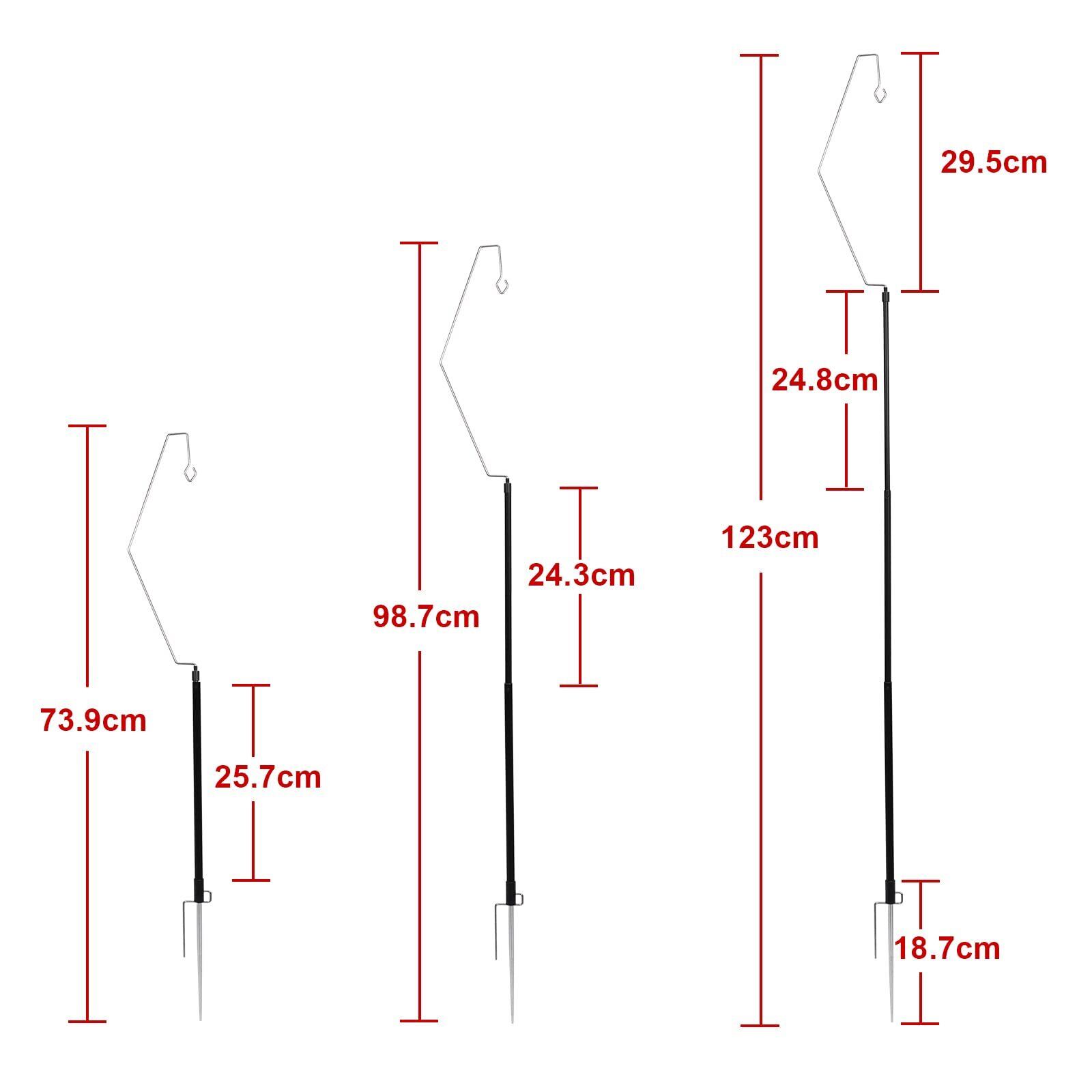【軽量アルミ製・組み立て式収納】伸縮式ポール長さは3段階調節可能で、約73.9cm・98.7cm・最大123cm、重量約84g、収納ケース16g。