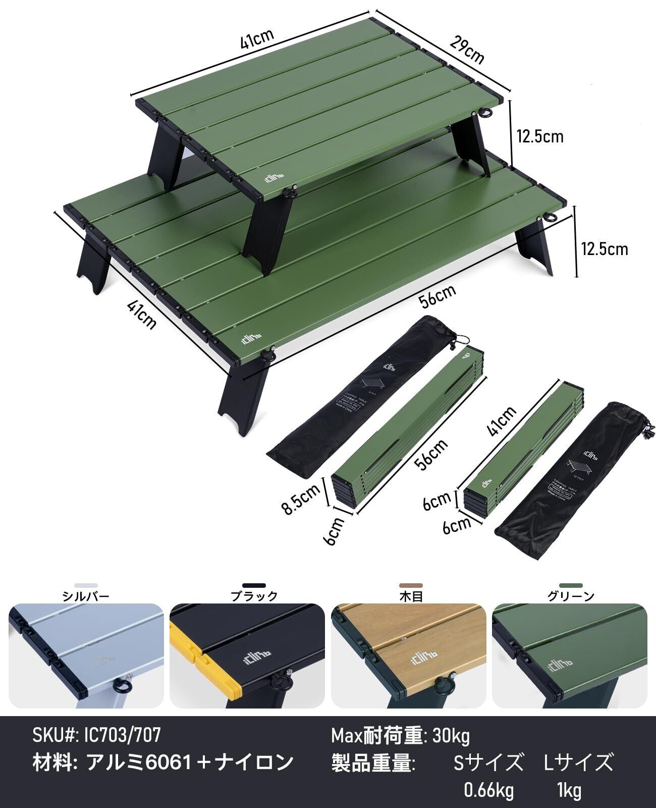 【iClimb(アィクライム)】キャンプ小型ローテーブル アルミロールテーブル ロール天板最新デザイン 耐久性強化 展開56X41X12.5cm(Lサイズ) 1kg超軽量 折りたたみ コンパクト 携帯便利 収納袋付き 耐熱 防水 防錆 耐腐食 耐荷重30kg L-Green(グリーン)