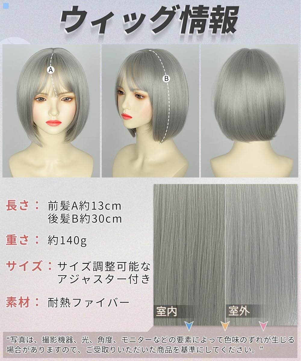 Vigorousウィッグ ボブ グレー ショット フルウィッグ かつら レディース ストレート 小顔効果 オシャレ 女装 原宿系 ロリータ 自然 可愛い 耐熱 普段使い