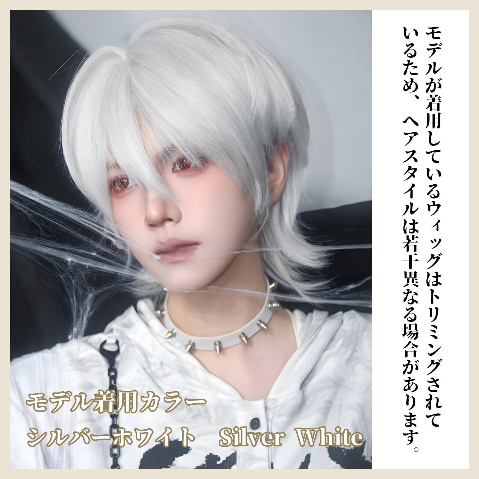 FESHFEN ウィッグ メンズ ウルフ かつら フルウィッグ ショート 黒髪 ウィッグ 短髪 男性 ウルフカット 男装 ハンサム 普段使い ふわふわ ファッション イケメン wig 原宿 自然 男女兼用 耐熱 人気 ネット/櫛付き 銀白色 シルバーホワイト