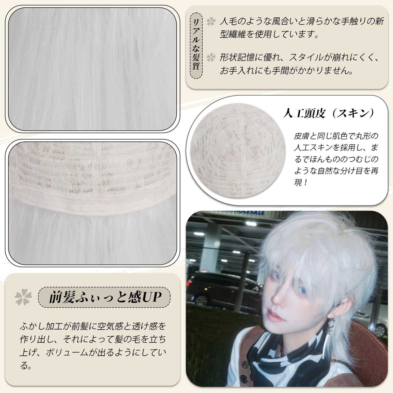FESHFEN ウィッグ メンズ ウルフ かつら フルウィッグ ショート 黒髪 ウィッグ 短髪 男性 ウルフカット 男装 ハンサム 普段使い ふわふわ ファッション イケメン wig 原宿 自然 男女兼用 耐熱 人気 ネット/櫛付き 銀白色 シルバーホワイト | Bloomia
