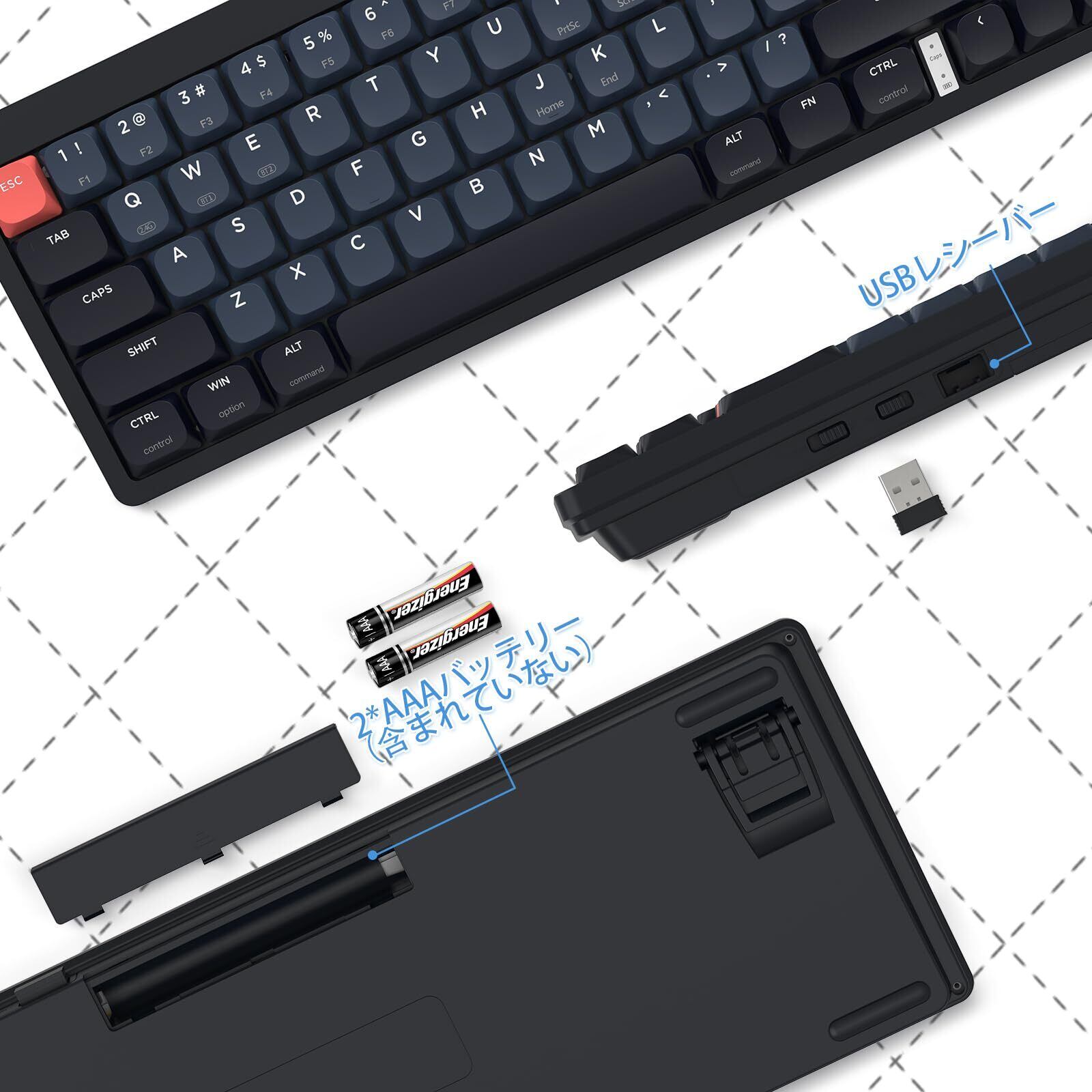 【単4形乾電池駆動】従来の充電式ワイヤレスメカニカルキーボードのデザインと異なり、この軽量ワイヤレスキーボードには乾電池の単4形で電源を使用し、もはや充電忘れの痛みを心配する必要はありません。こちらのゲーミングキーボードは、一般的なパソコンメカニカルキーボードが持つRBGバックライトを除去し、軽量ワイヤレスゲーミングキーボードと同様の航続能力と携帯性を得ています。 (軽量ゲーミングキーボード本体には乾電池は付属していませんので、別途お買い求めください。)