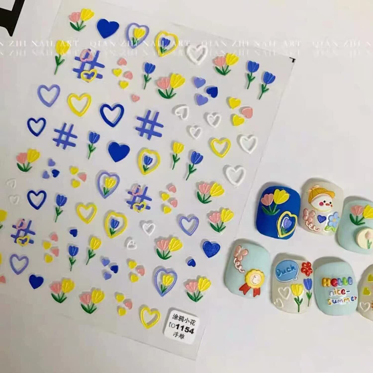 グラフィティイエローダックネイルアートステッカーデカールガーデン5Dエンボスかわいい自己接着性手描きグラフィティカラフルフラワーネイルアートステッカー女の子のためのDIYデザインデコレーション女性キッズマニキュアギフトネイルチャーム(2枚) | Bloomia