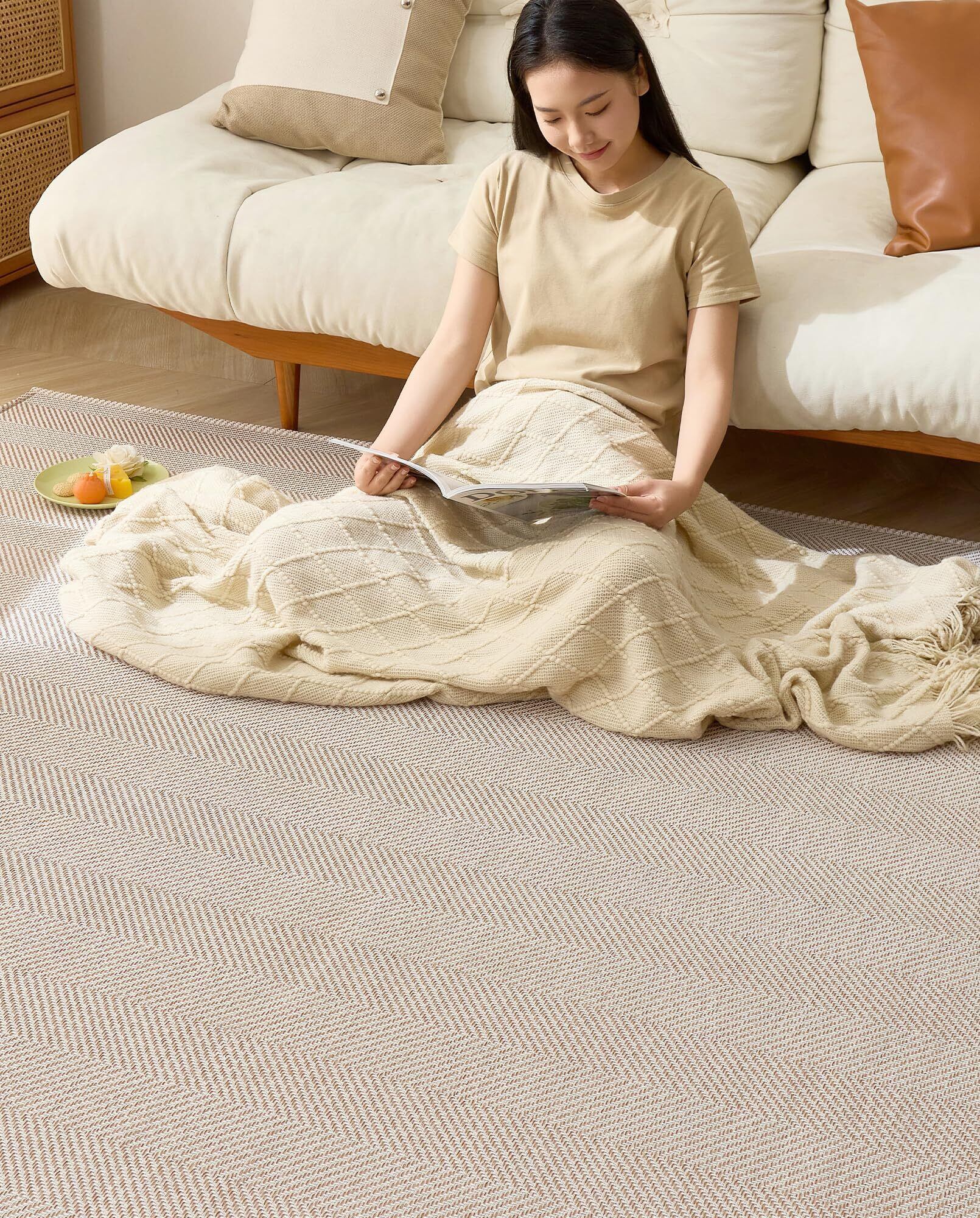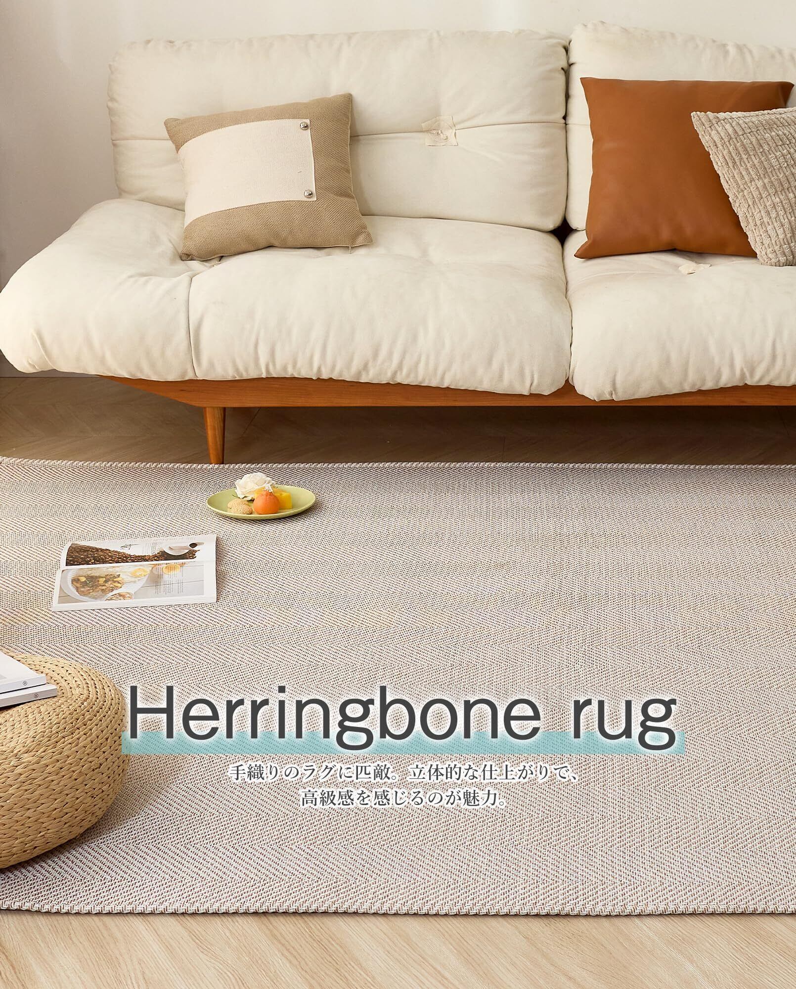 【VK Living2025の新登場!ヘリンボン柄ラグ】白系と優しい色合いの糸を混ぜて、見た目が開いた魚の骨に似ていることから名付けられた「ヘリンボン」。おしゃれなヘリボーン織りと自然な立体感、高級感を演出。柔らかさと大人の雰囲気を兼ね備えた上品なデザインに仕上げました。