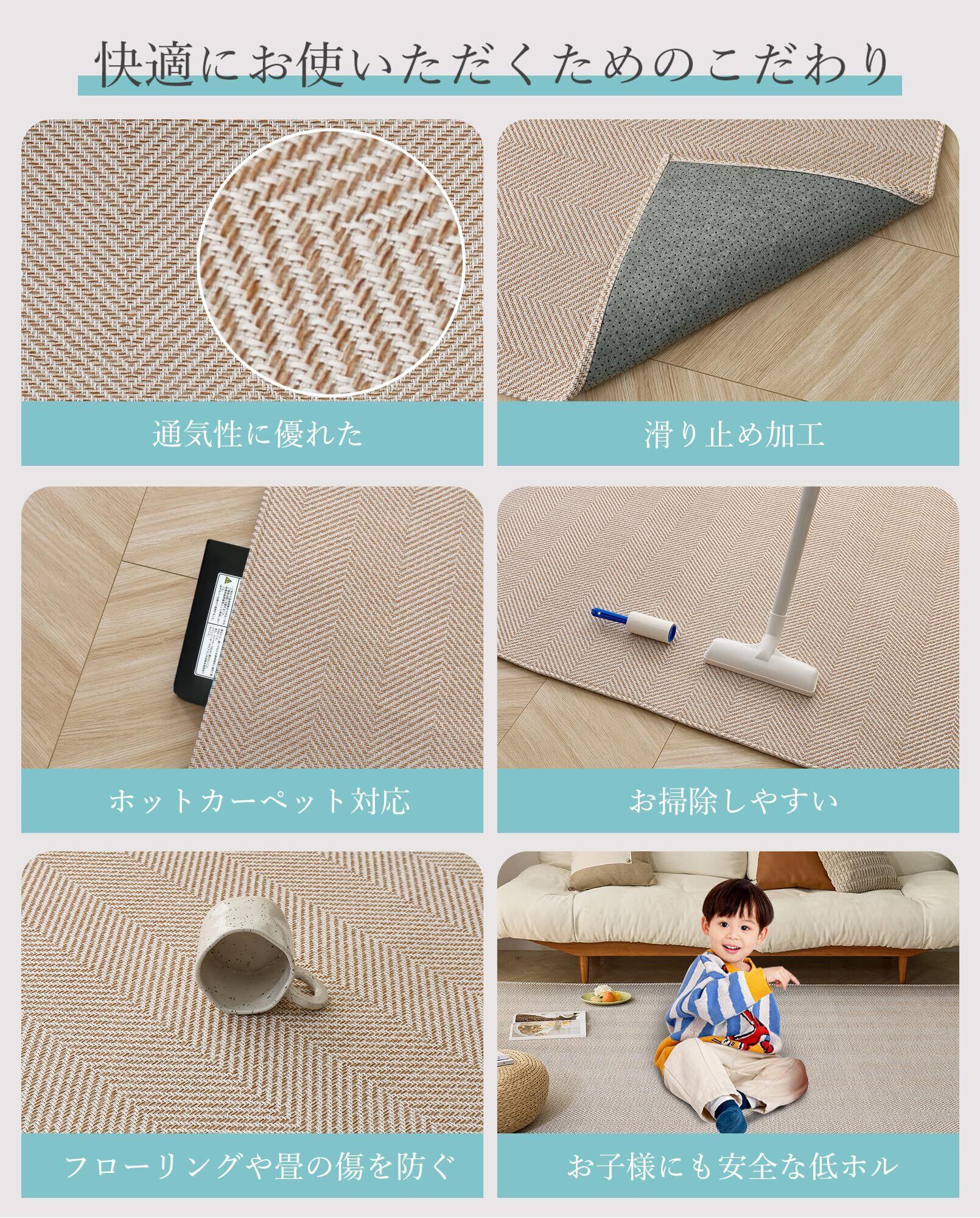【安全仕様!お子様にも安心なカーペット】浮き毛のない編み込みカーペット、裏面には滑り止め加工をした不織布を使用して、防臭・防ダニ加工を施し、消臭率とホルム検査合格し、お子様にも安心してお使いいただけます!