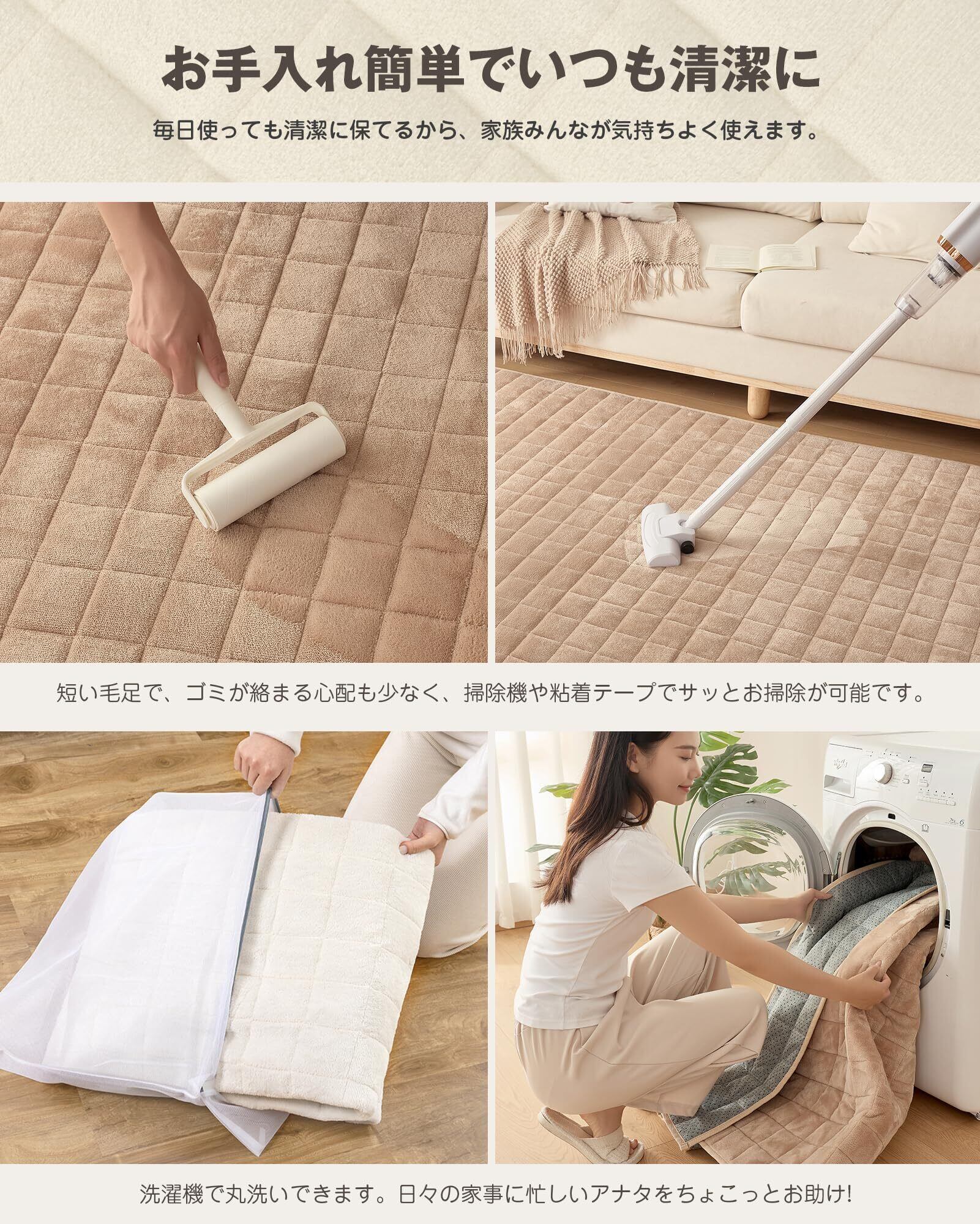 【掃除も楽々】毛足が短いのでゴミが絡まる心配も少なく、掃除機や粘着テープでサッとお掃除が可能です。ご家庭の洗濯機でまるっと洗えてお手入れ簡単です。フランネルキルトラグは軽く取り扱いが簡単、移動や収納も楽々です。