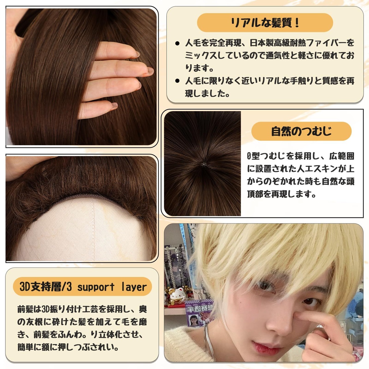 ご注意:ご使用初期は、生産工程上でカットされたファイバーや、ミシンでファイバーを縫い付けた際の縫い余りのファイバーが比較的多く混入しており、抜け毛のように見られる場合がございます。ご使用を始める前に、ウィッグを軽く振り、優しくブラッシングしてからご着用ください。