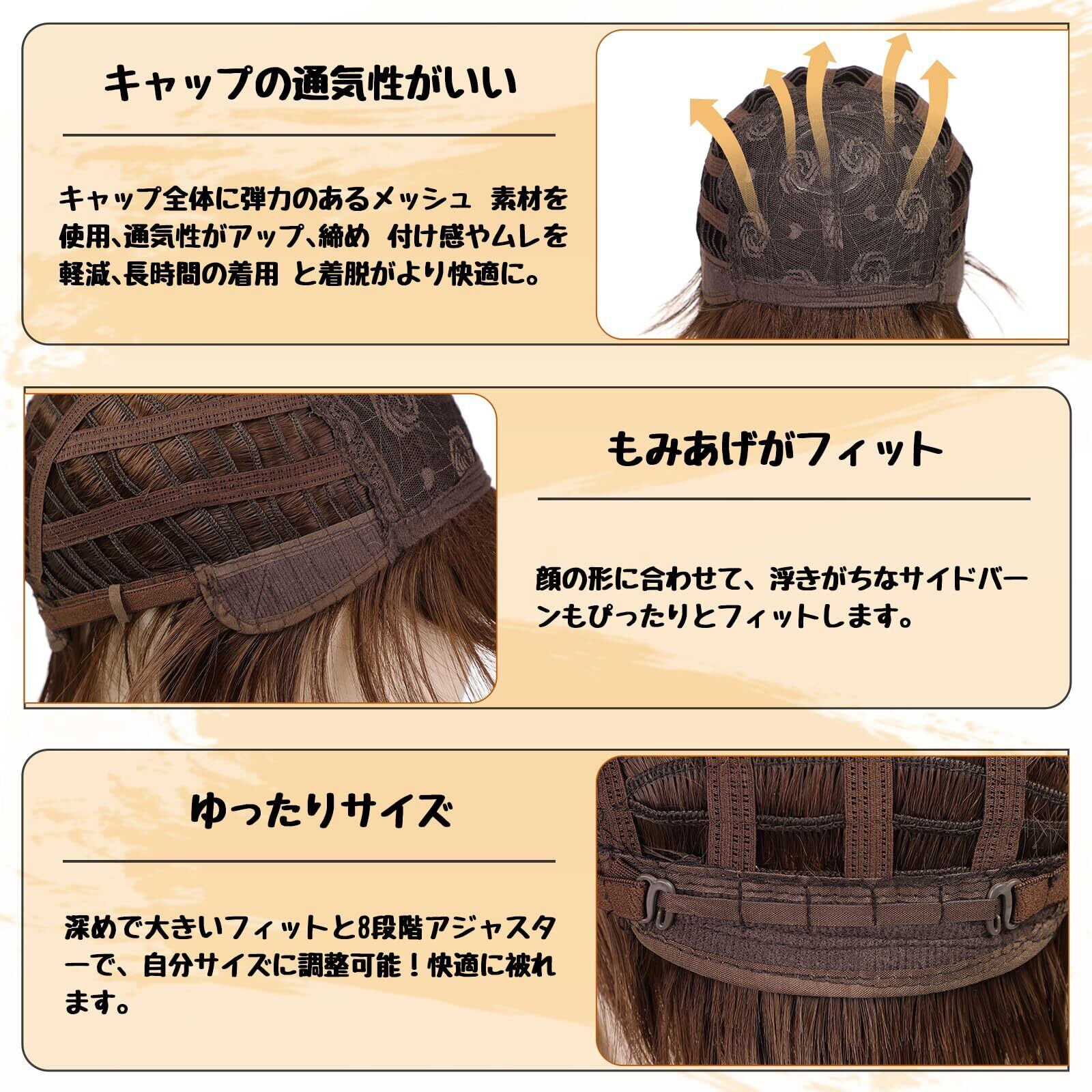 仕様:①前髪:約15cm;後髪:約25cm;重さ:約118g(つむじから自然な状態で測定。計りにより、1cm-3cm誤差が生じる場合がございます。)②サイズ:フリーサイズ。アジャスター付きなので、個々の頭の大きさに合わせて段階調節することができます。頭周り53〜56㎝に調整することも可能です。
