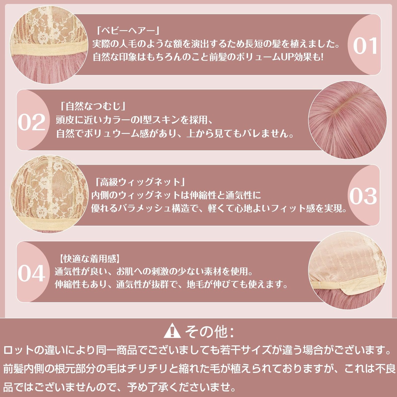 【快適なフィット感を追求した設計!】耐熱性のある素材を使用しているため、スタイリングも自在で、髪型を自由にチェンジ可能です。ネットと櫛付きで、簡単に着脱ができ、すぐにおしゃれを楽しむことができます。軽量な素材が負担にならず、長時間の着用でも快適さを保てます。