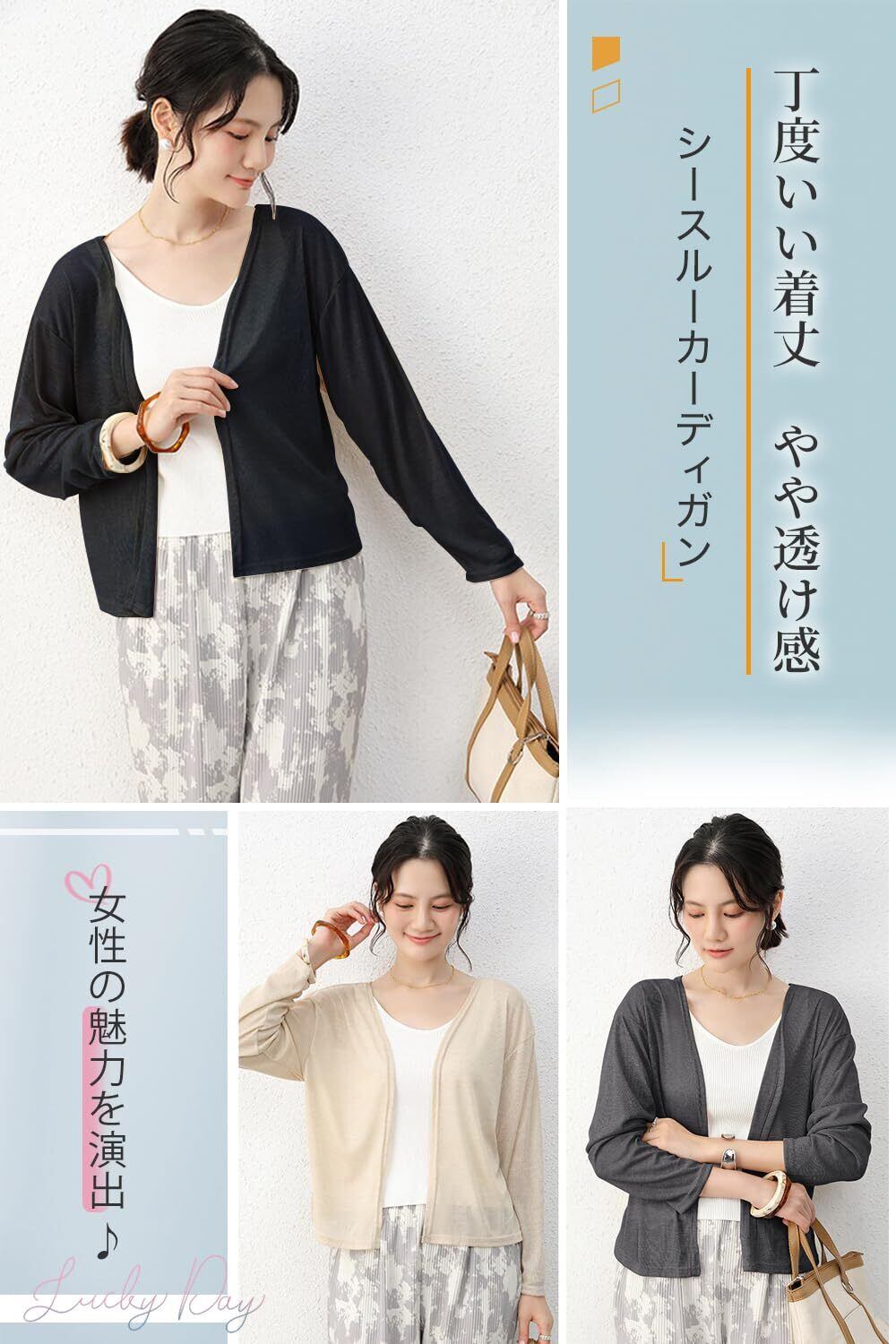 【薄手・軽量・女性らしい】超薄い、超軽い、畳むだけでカバンに入れて持ち歩くことが大変便利!Vネックデザイン、しかもやや透け感がある生地を採用したことで、大人女性のフェミニンがあふれ出す夏用カーディガンです。柔らかい肌触り、伸縮性通気性よいので汗をかいてもベタつきにくく、着心地が最高のレディースカーディガンです。