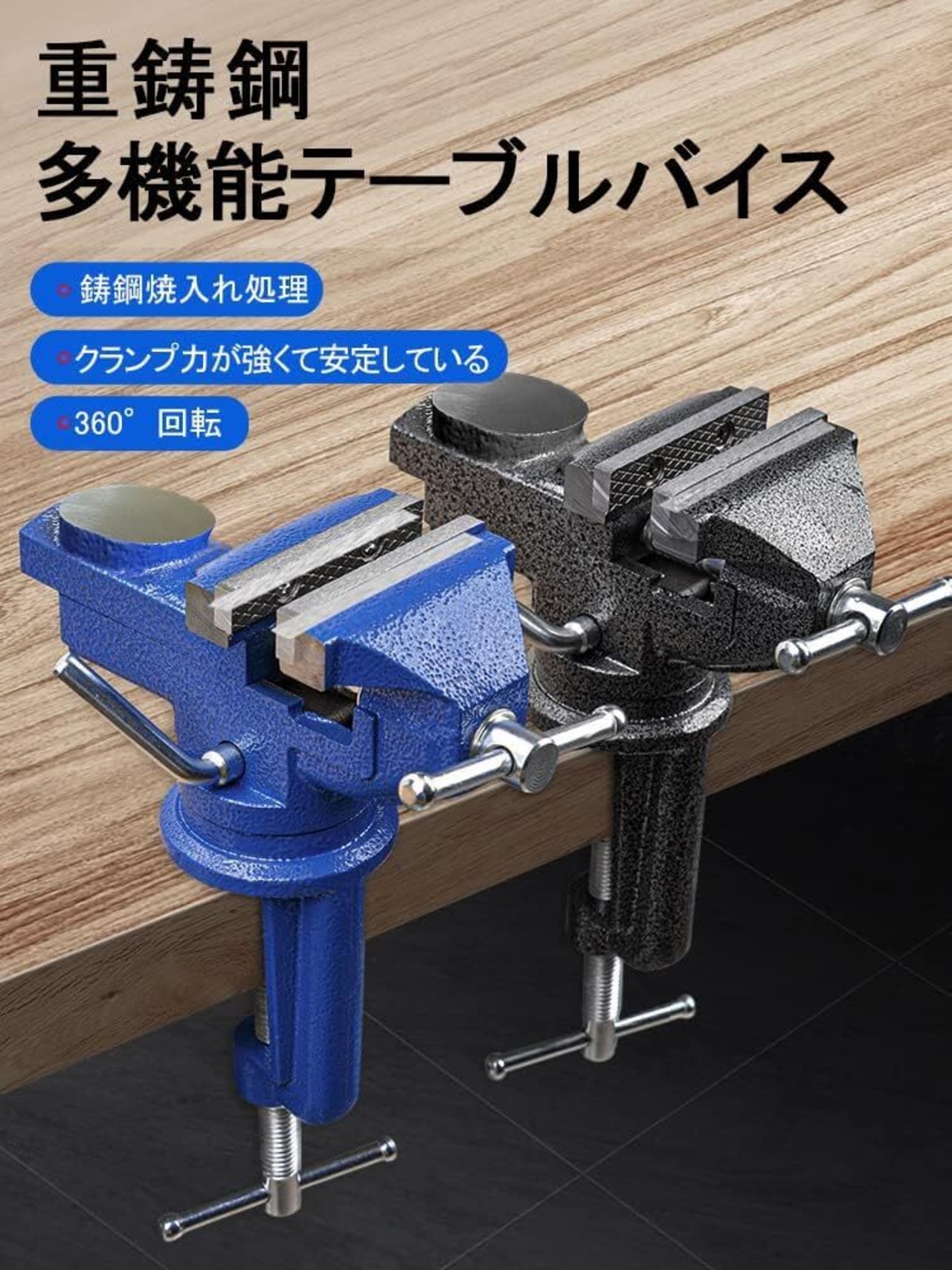 [最大開口75mm 小型卓上万力青 360°回転盤付き ベンチバイス クランプ 携帯用作業台 木工 導管 穴あけ 金属加工]