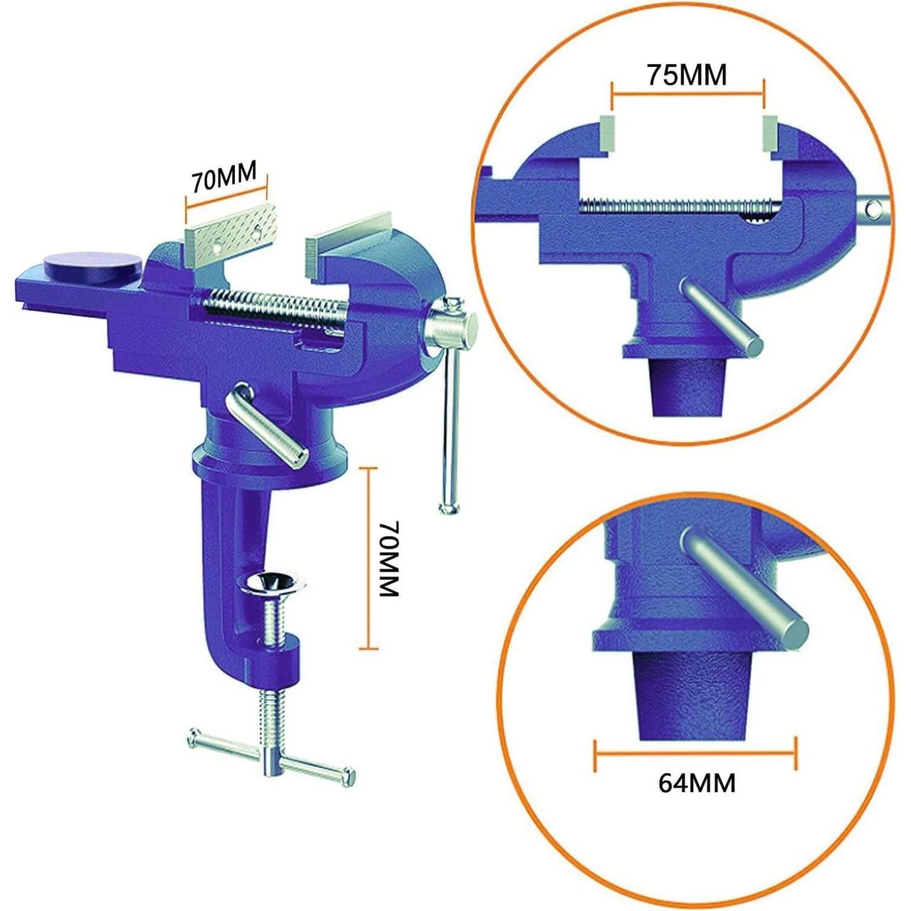 最大開口75mm 小型卓上万力青 360°回転盤付き ベンチバイス クランプ 携帯用作業台 木工 導管 穴あけ 金属加工
