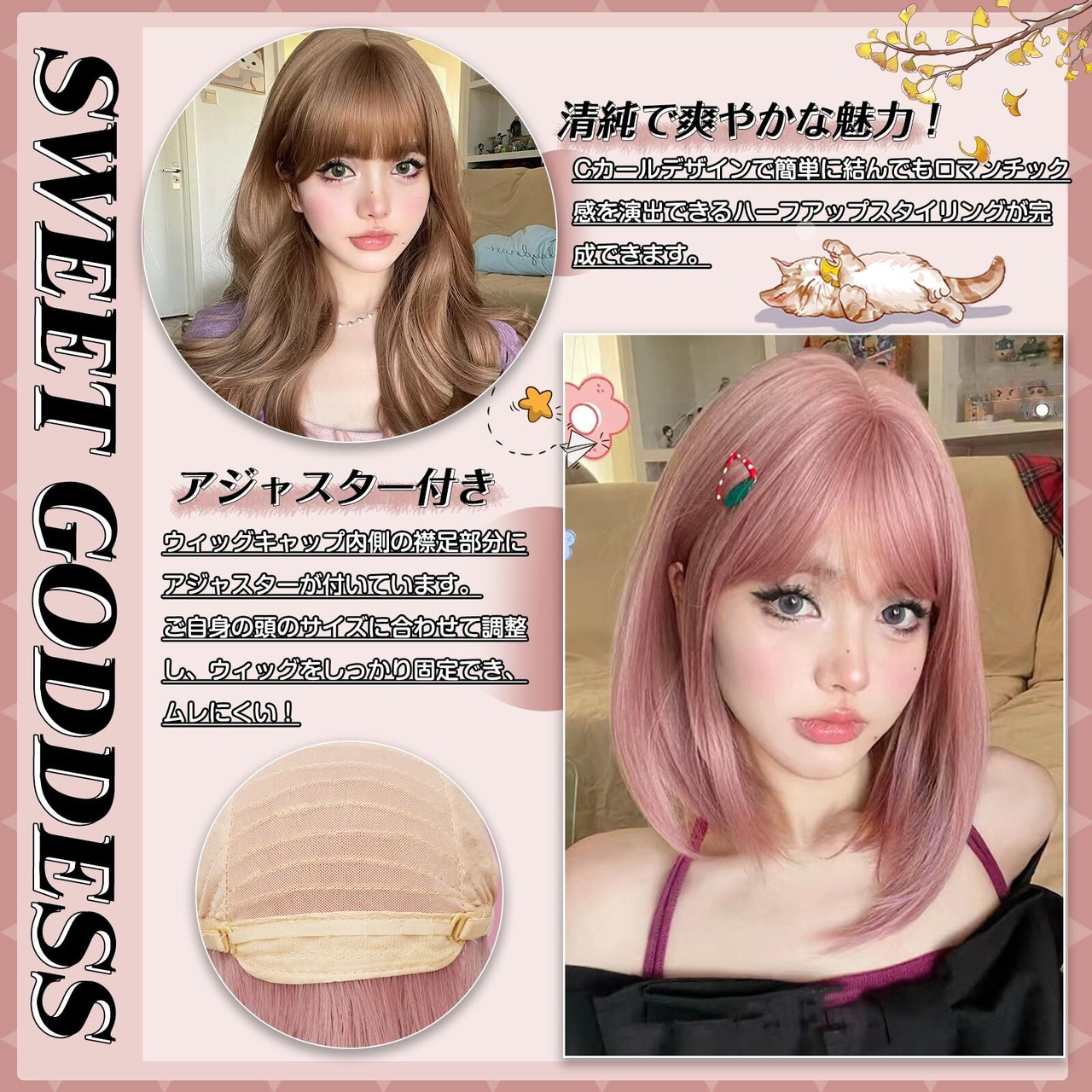 [Hawkko] ウィッグ セミロング ボブ ストレート ミディアム 黒髪 ショート ウィッグ ロング フルウィッグ レディーズ ぱっつん前髪 女性 かつら カツラ 女装ウィッグ 自然 ロングウイッグ コスプレ 原宿系 日常 wig 小顔 耐熱 ネット/櫛付き(アッシュピンク)