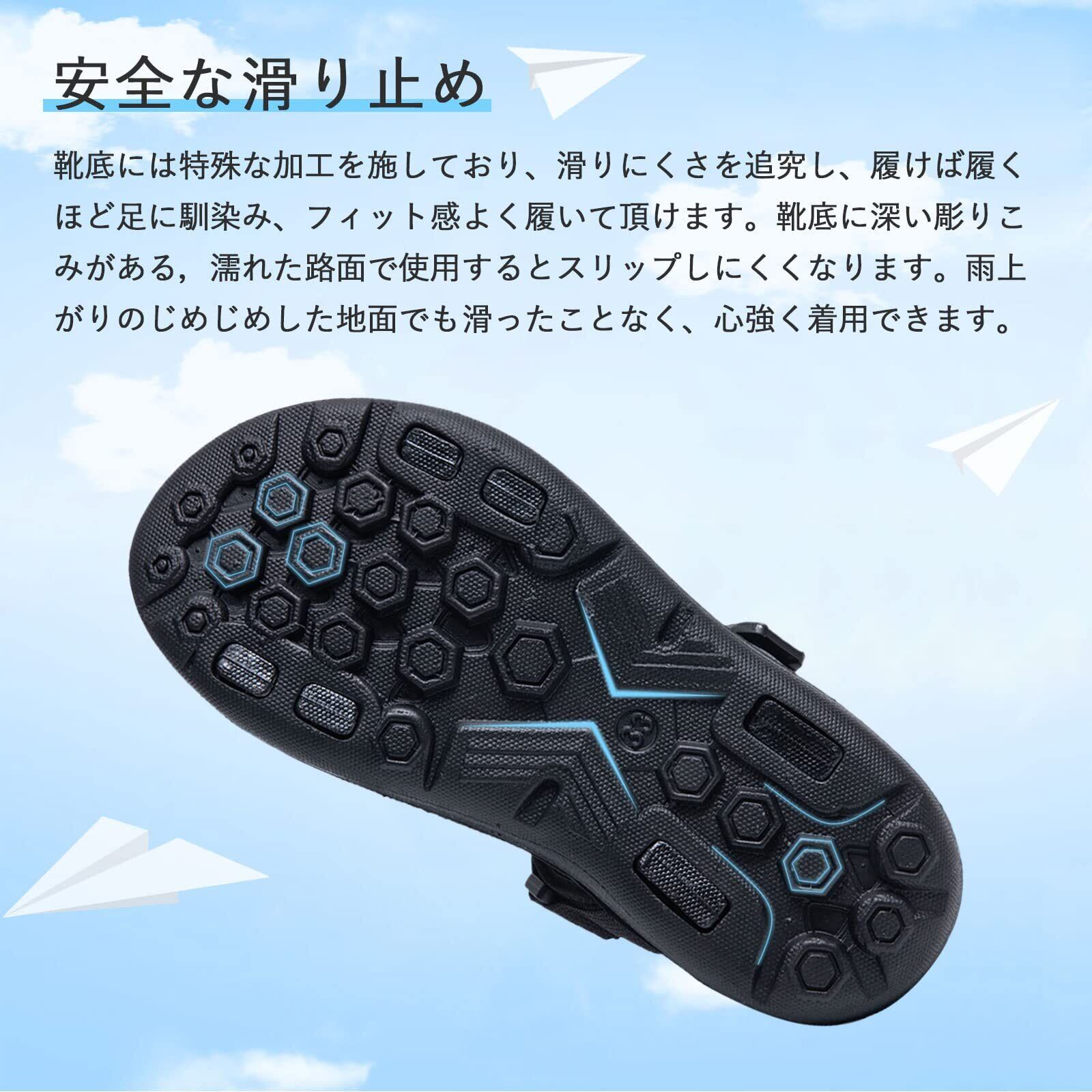 【ベルクロデザイン】マジックテープ式小さなお子さんでも一人で脱ぎ履きがしやすく便利です。3つのマジックテープを付いて、足の幅に応じてサイズを調節できます。サイズはゆったりとした大きさになっているので、成長期のお子様の成長速度にも対応できます。