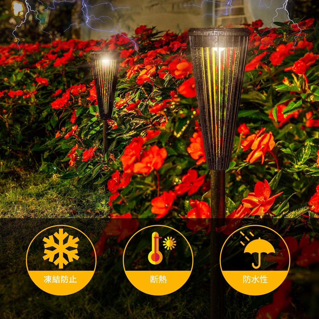 【IP65防水・耐候性】ソーラーライト防水レベルはIP65なので、大雨や雪の日でも安心してお使いいただけます。そして厚みのある耐食性素材で作られ、雨、雪、極端な温度など、あらゆる種類の気象条件に耐えることができます。