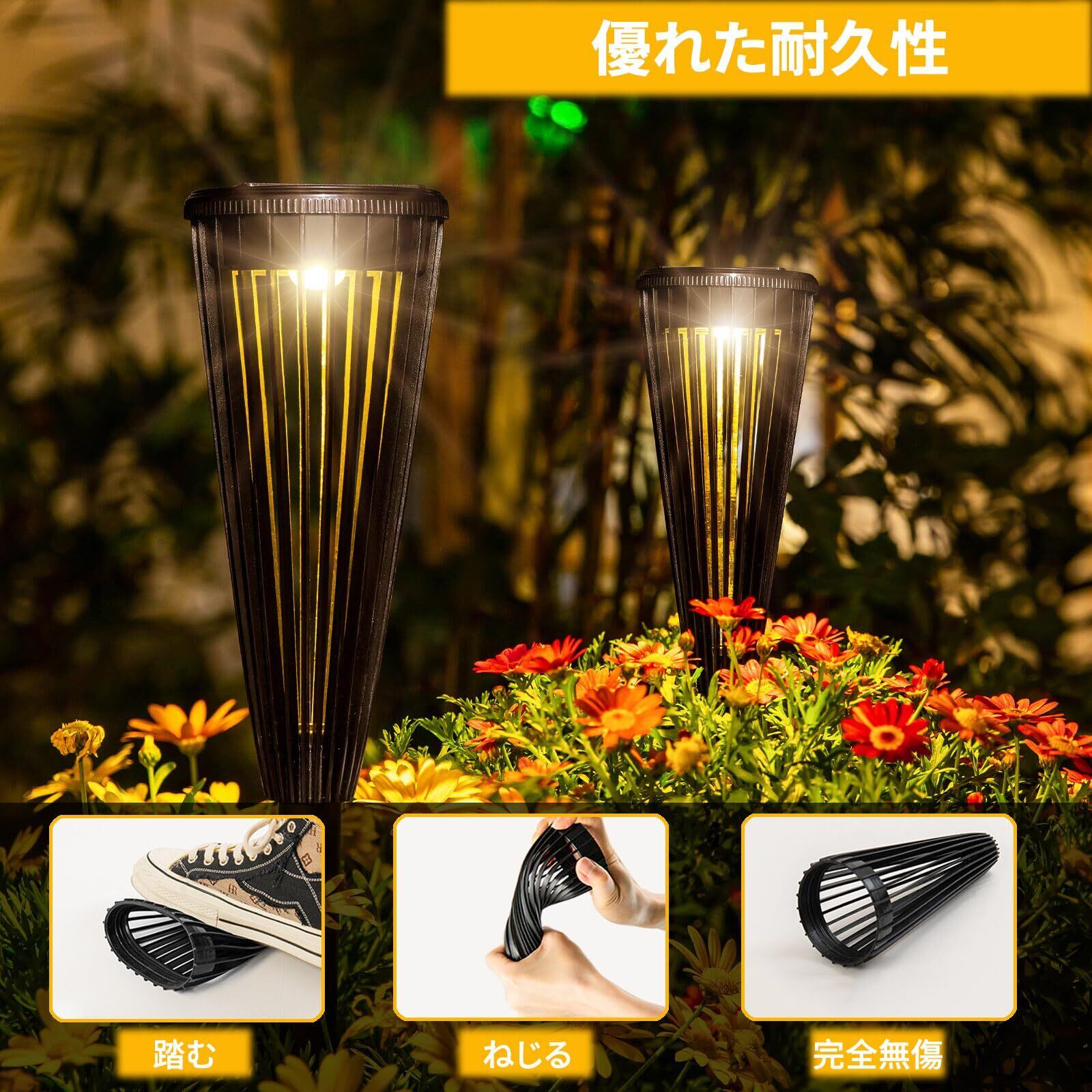 【2024最新版・しなやかで強い素材・自動オン】2024年最新の外観デザイン、シンプル・軽量・実用的。新しい環境保護工事材料を採用し、転圧し戻し、脆くなく割れない。踏みつけたり、ねじったりしても無傷です。ソーラーガーデンライトを庭に設置しておくと長く作業ができます。