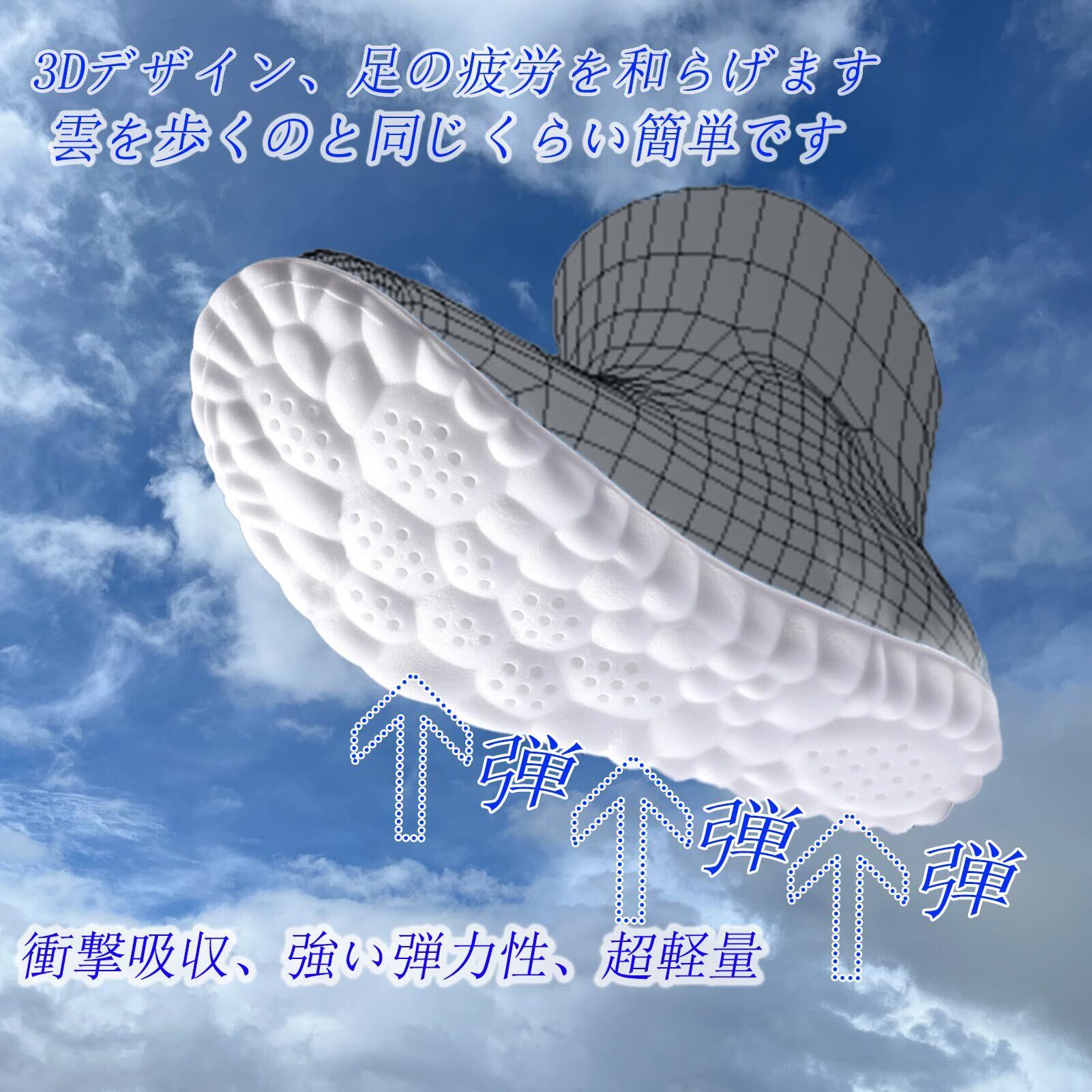 衝撃吸収抜群 低反発素材は素早く元の形状に戻り、歩行や運動中の地面からの衝撃を効果的に和らげます。衝撃吸収性で快適な履き心地を提供し、一日中立ち買い物をしても疲れません。着用中に素晴らしい弾力性が維持され、スポーツなどに最適です。