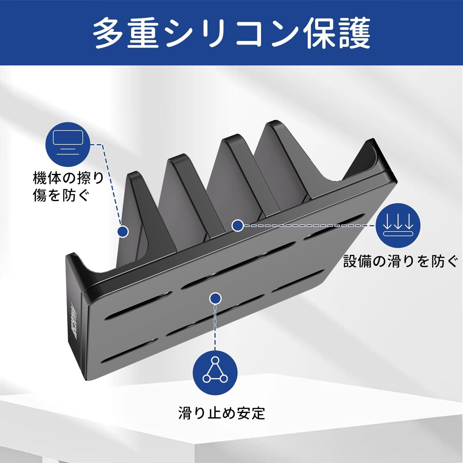 「5台収納可能のPC縦置きスタンド」複数台のノートPCに限らず、タブレット、スマホ、キーボードなどの使い方もあるの縦置きパソコンスタンドです。デバイスをに縦置きして収納できることで、場所を取らず、作業スペースやデスクスペースを節約できます。