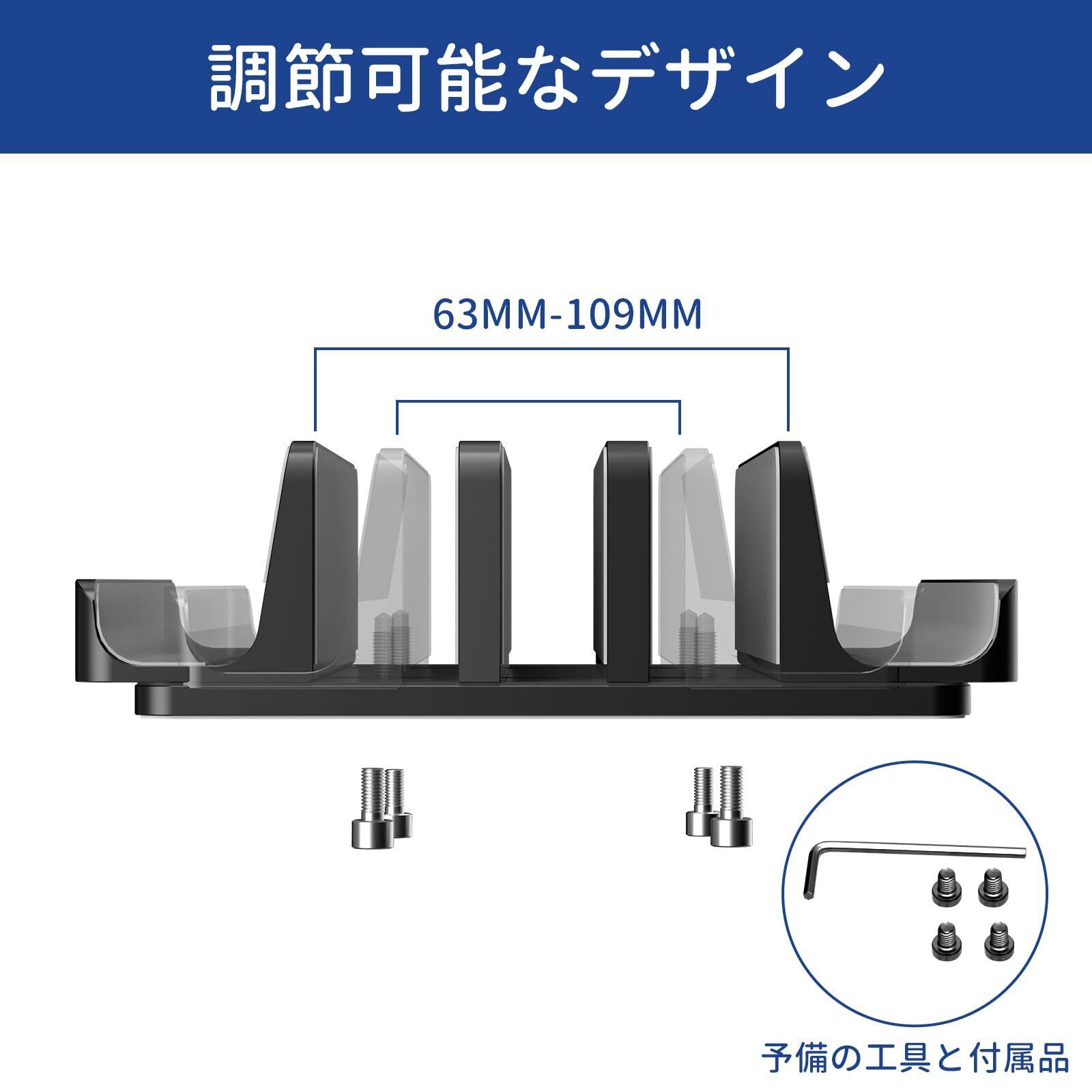 「置き幅を調整出来る」厚みの調節部はねじ式になっています。付属の六角レンチで幅広くご利用いただけます。 幅も変えられるのでpc以外にも様々なものを立てられます。予備ネジが4個付いていますので、万が一にも対応いただけます。幅調節範囲:63mm-109mm。 ※厚さが約38mmまでの機器も収納できます。