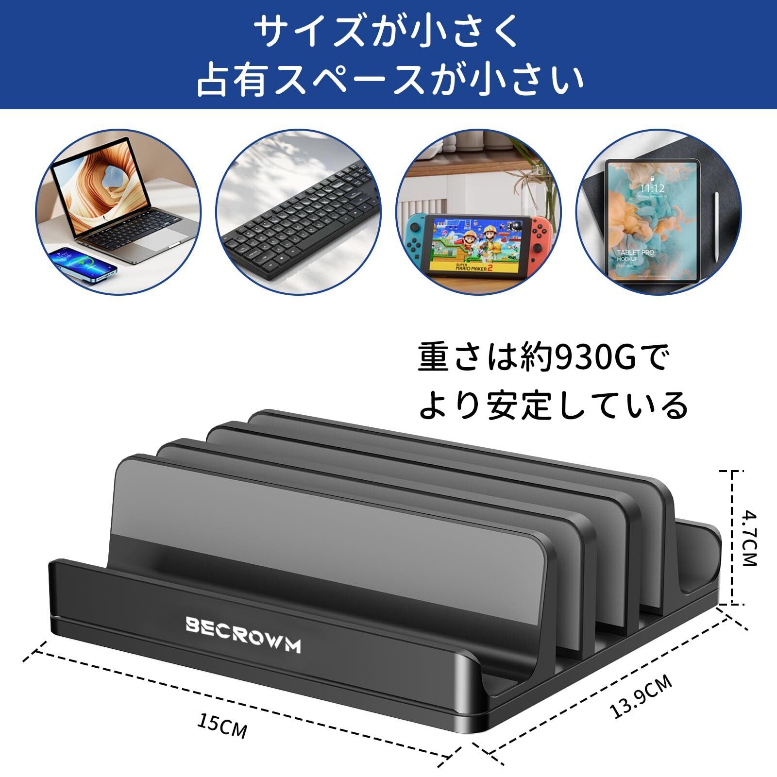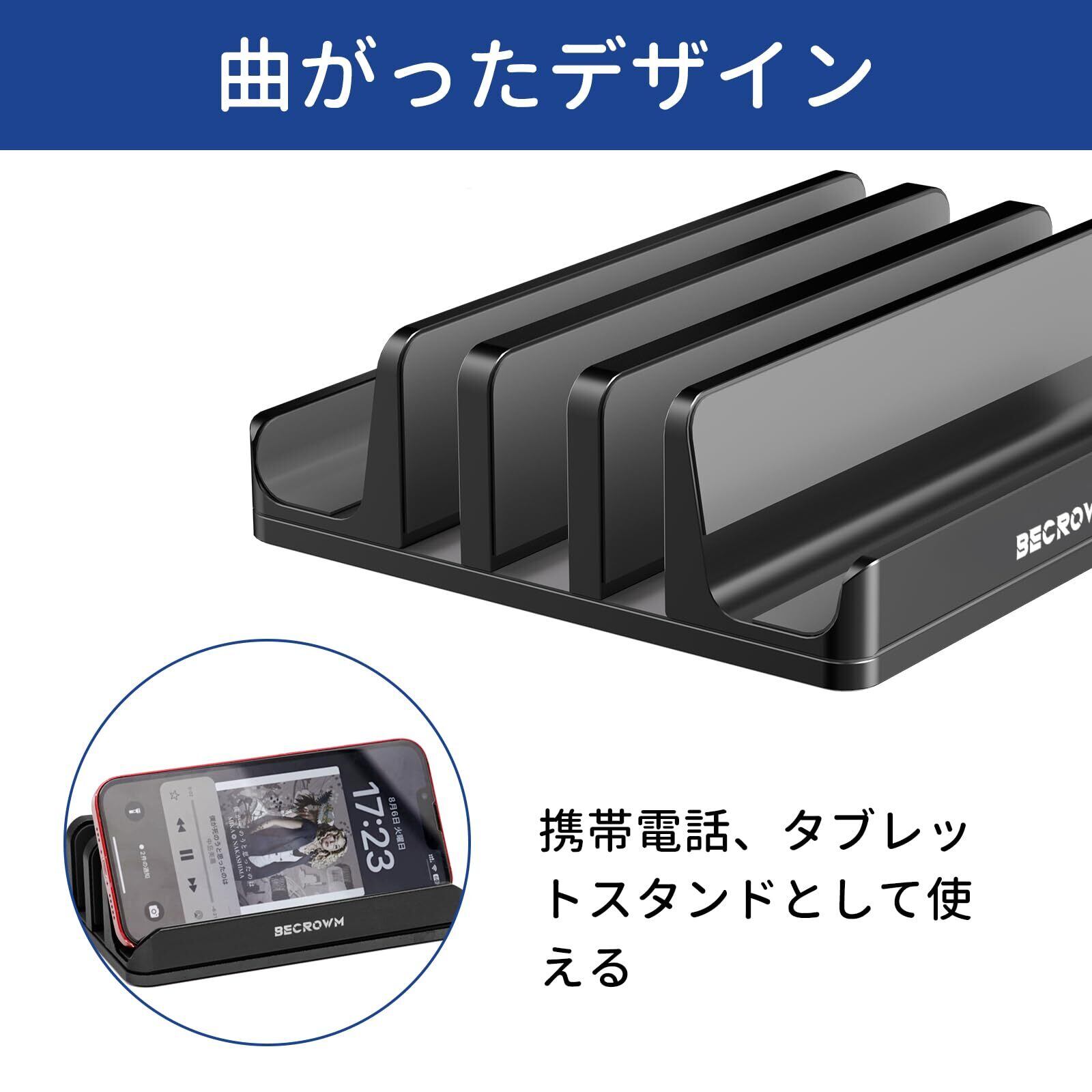 この[BECROWMノートパソコンスタンド]は、縦置き設計で5台のデバイスを収納可能。デスクやテーブルの空間を有効活用し、スッキリとした作業環境を作り出します。MacBook Pro/AirやMicrosoft Surfaceに最適なデザインで、スタイリッシュなグレーの仕上げが美しく、あらゆるインテリアに調和します。
