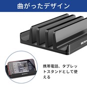 「安定感抜群でスマートに収納」930gの重量で大型のラップトップでも問題なく しっかりと安定してノートPCを置けます。真ん中の溝には三台の機器置き場にしています、一方だけでも倒れたりすることなく安定して支えられます。 本体にそれなりの重さがあるので、落下に怪我のないよう十分にご注意ください。