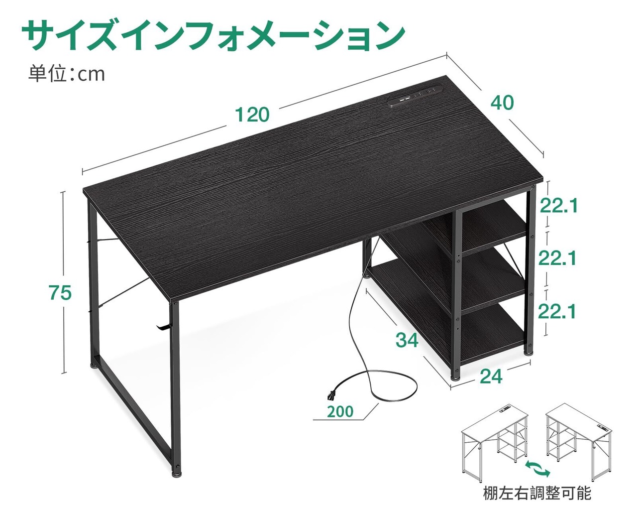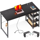 本デスクは、コンセント付きで、デバイスの充電や接続がスムーズ。3段のラックが付いており、書類や文具、小物をしっかり収納でき、作業スペースを常に整理された状態に保つことができます。さらに、収納フックも付いているため、バッグやヘッドフォンを簡単に掛けられ、便利です。