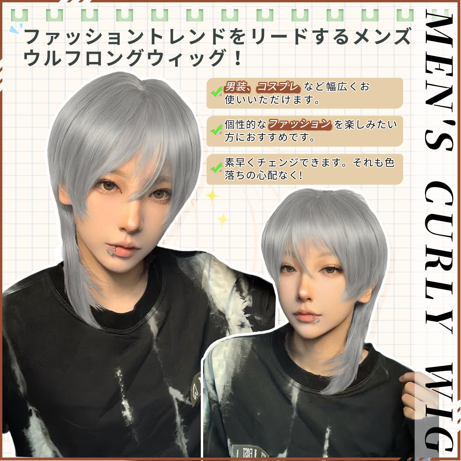 [FORCUTEU ウィッグ メンズ ロング グレー ウルフ フルウィッグ コスプレ ファッション 耐熱 人気 ネット/櫛付き]