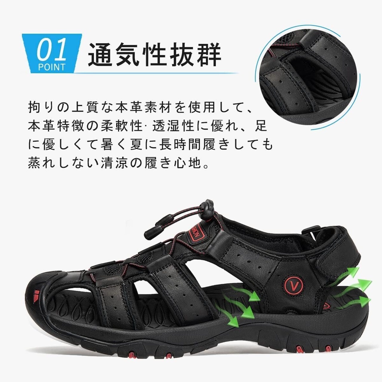 【高級本革製】品質が最も良いサンダルを提供できるため、様々種類の革の中に念入りに選んで、一番優秀な上層部革をチョイスしました。アッパーだけではなく、足の裏と接触するところまで本革製です。