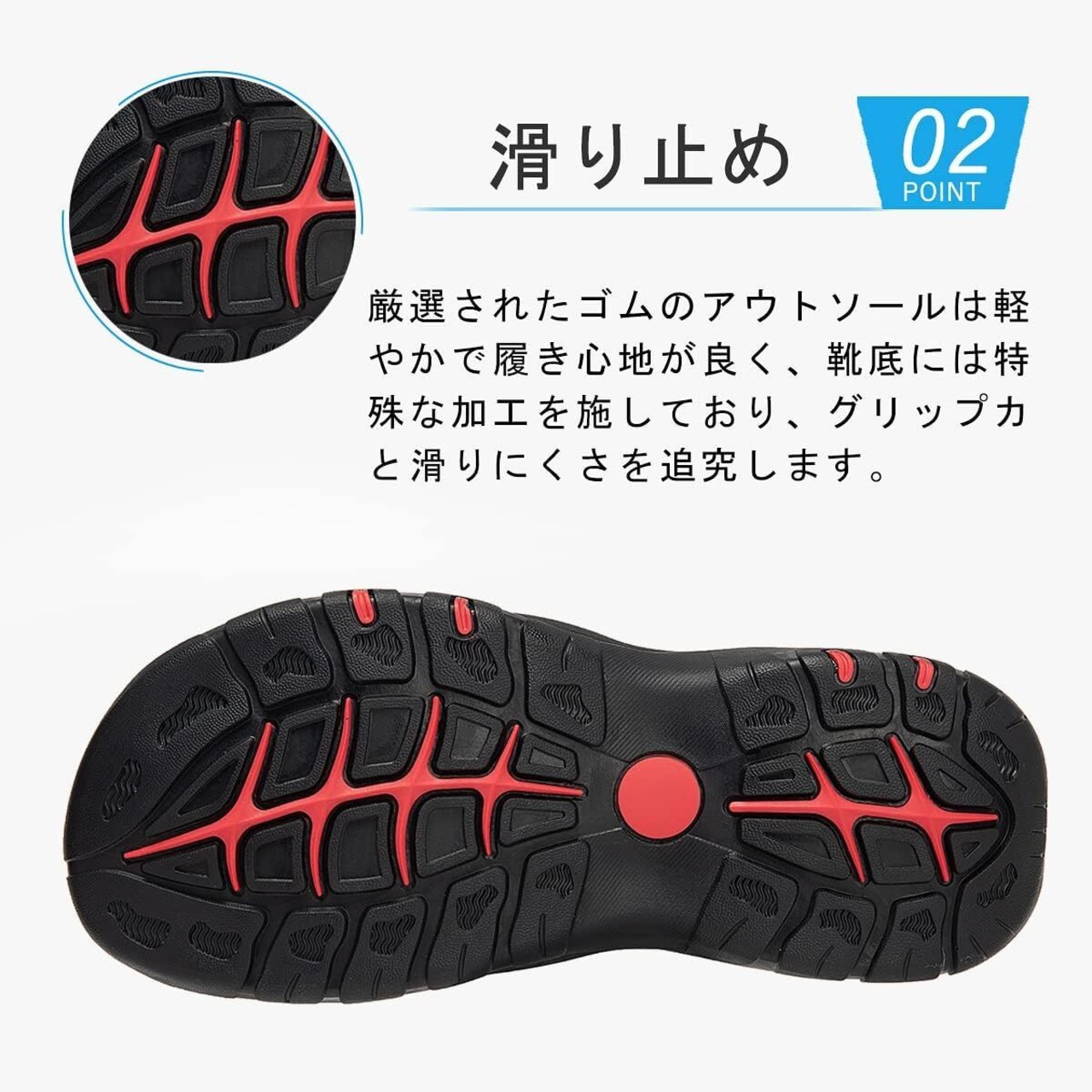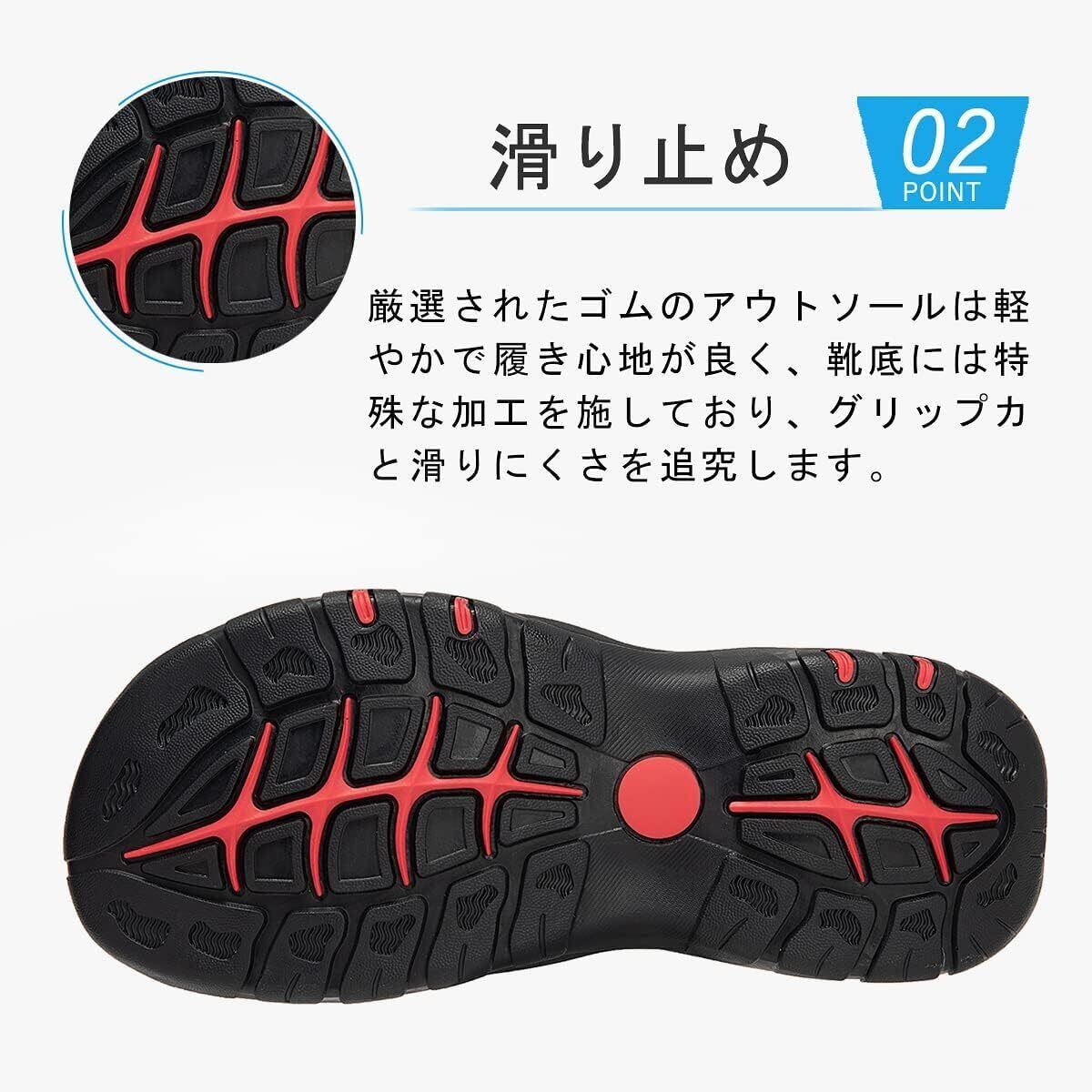 底部には特殊な防滑加工が施されており、濡れた場所でも安心して歩行できます。しっかりとしたグリップ力で、岩場や砂浜でも安定した歩行をサポートします。アクティブな日々を安心して楽しめます。