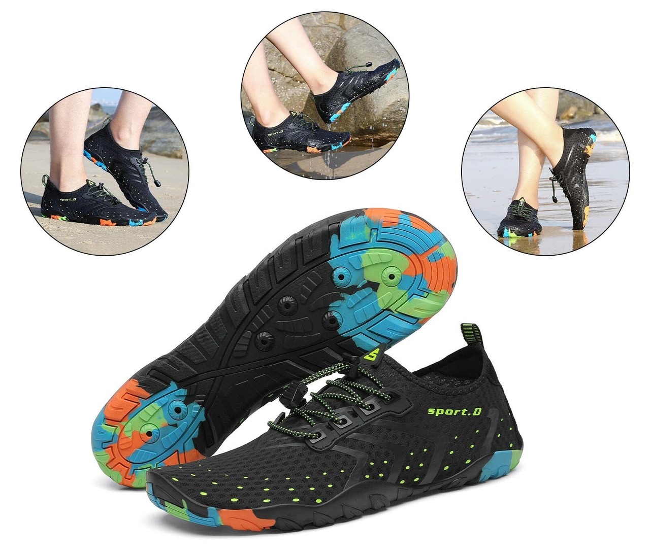 水の中でも陸でも履けるデザインで、シュノーケリングやビーチでの使用はもちろん、普段のカジュアルスタイルにもマッチします。防滑ソールが滑りやすい場所でもしっかりとしたグリップを提供し、安全に楽しめます。