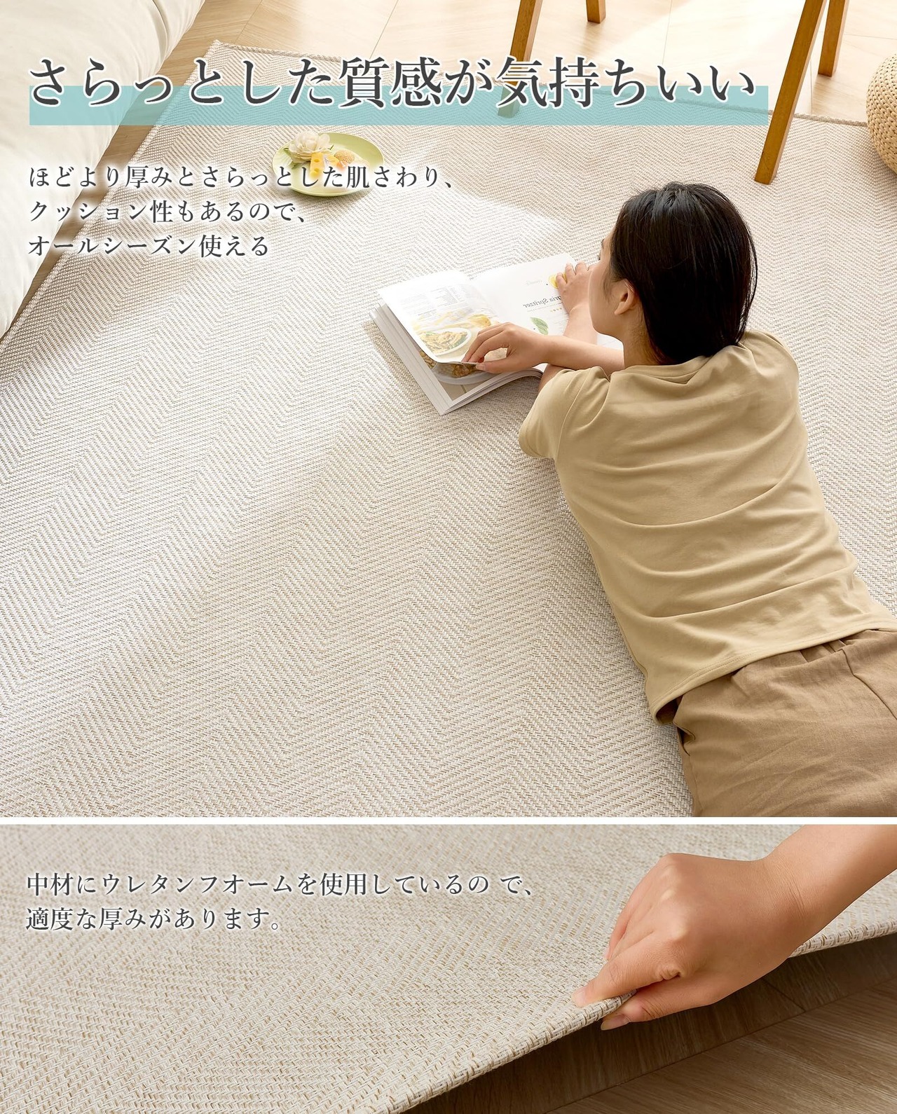 季節を問わず使えるオールシーズンデザイン!ホットカーペット対応で、寒い冬でも温かく快適さを提供します。また、素肌に優しい素材を使用しているため、素足でも心地よくご利用いただけます。