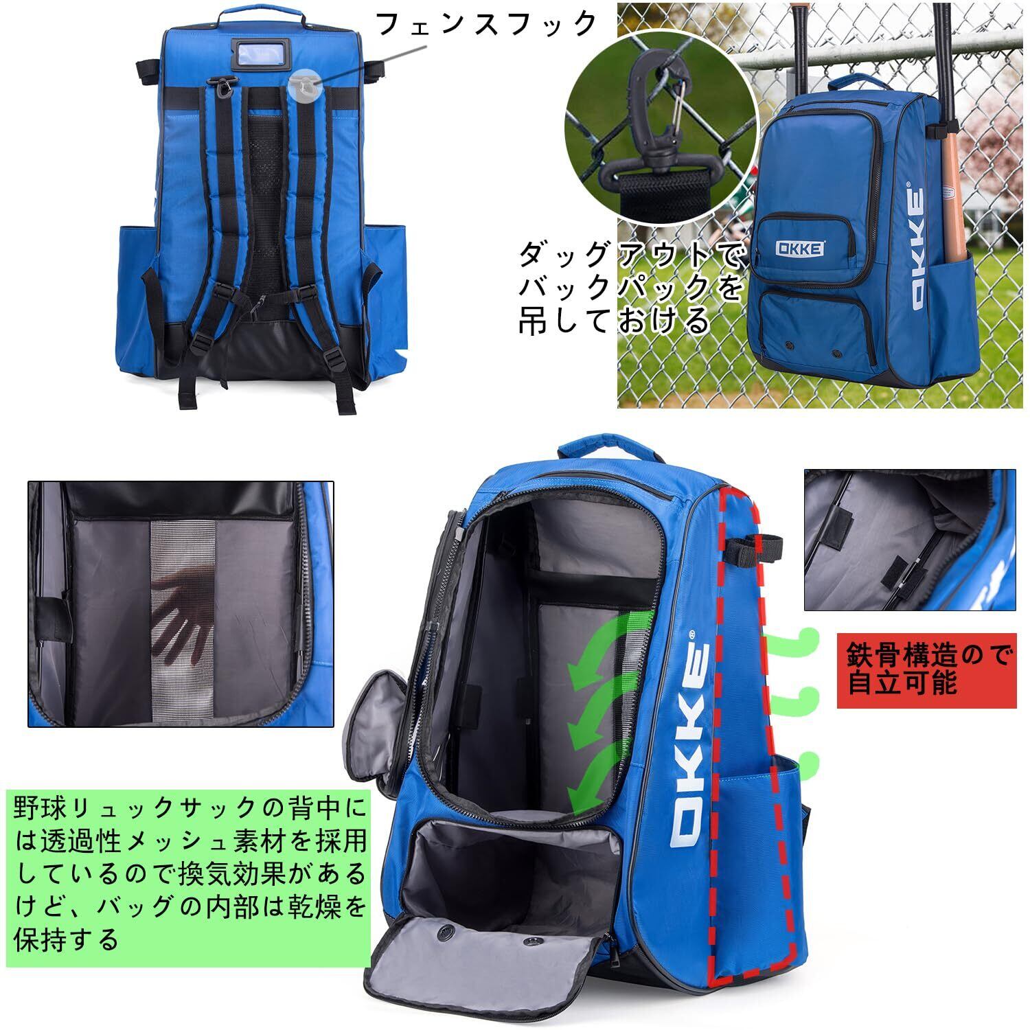 ●大容量野球バッグは野球ボール、グラブ、ヘルメット、バッティンググローブ、スパイクとキャップなどの物を別々に収納出来る