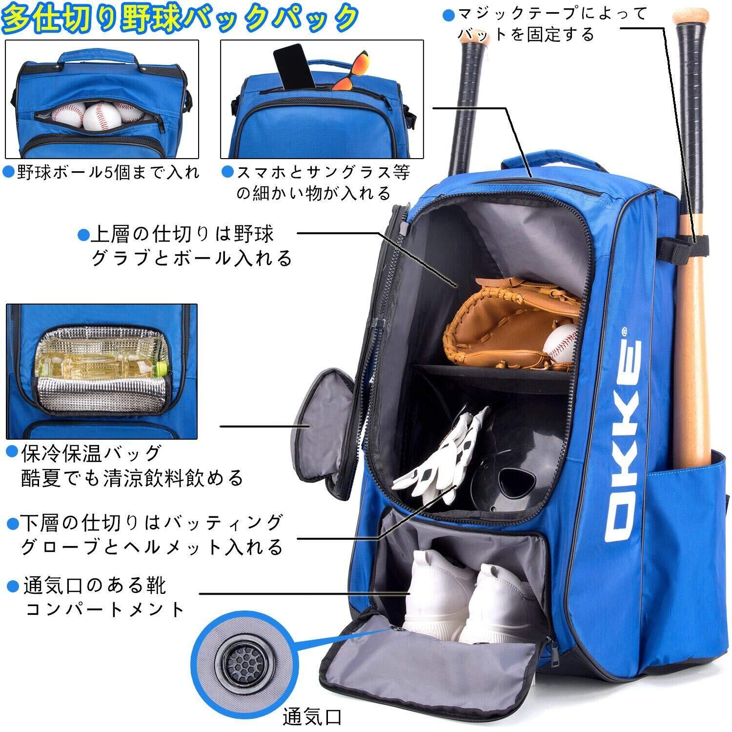 60L 野球 リュック ( クーラー バッグ 付き)、 大容量 野球用 バッグリュック ( バット 4本 収納 バックパック )