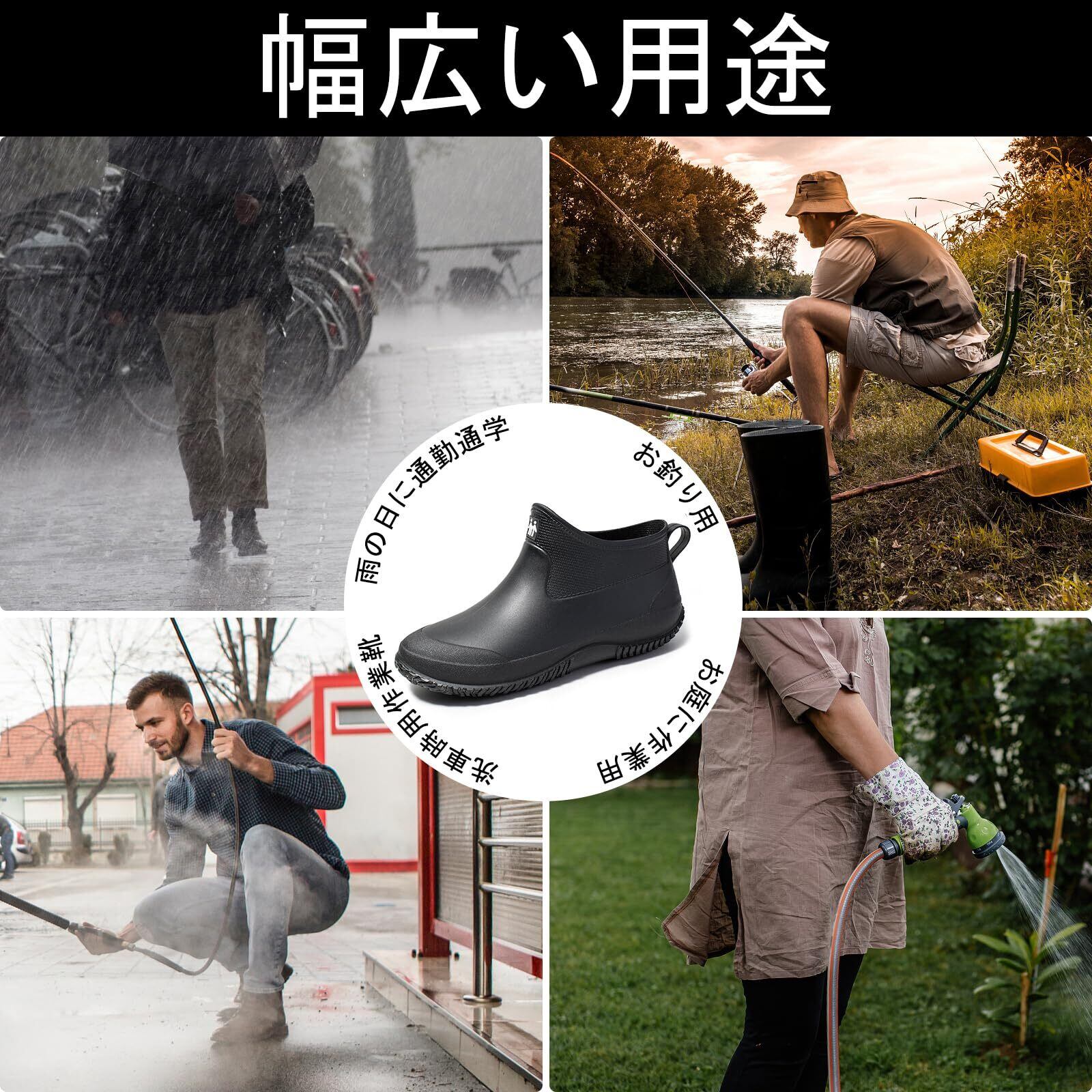 このレインシューズは、厨房靴としても使用できるため、洗浄や湿気の多い環境でも安心です。また、ボートや釣りなどのアクティビティにも最適で、機能性とファッション性を兼ね備えています。