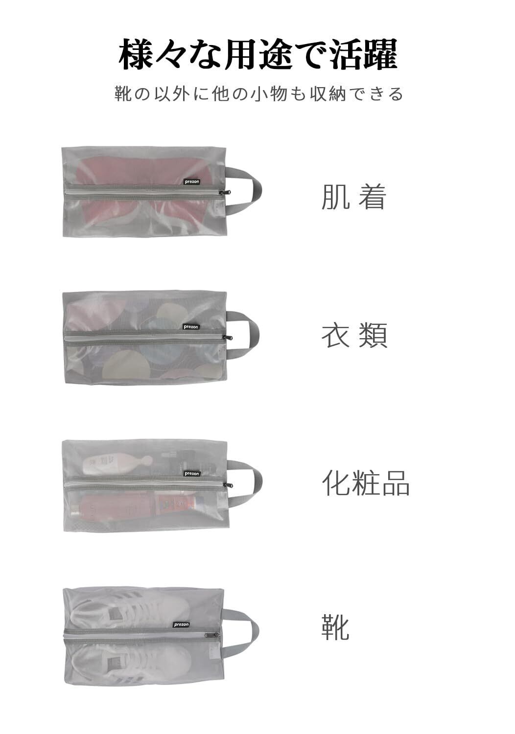 この【prezon シューズケース】は、靴や小物の収納に最適なシューズバッグです。軽量で持ち運びやすく、半透明のデザインにより中身が見やすいのが特徴。旅行や出張のお供にぴったりのアイテムです!