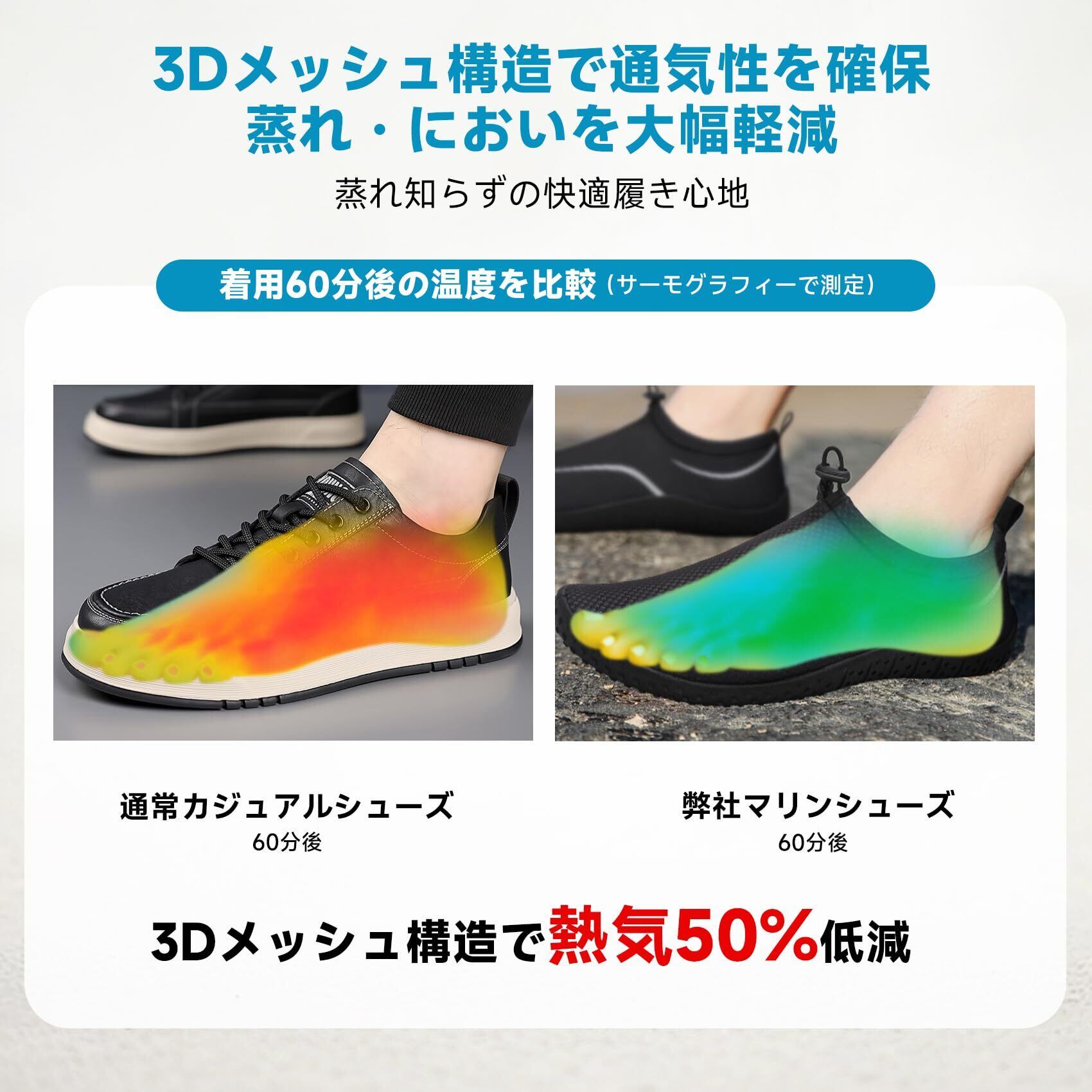 【全天候快適】メッシュ呼吸性×速乾機能→ 3Dメッシュ素材が通気性抜群。水切り性能UP設計でサンダル並みの速乾性を実現。蒸れ知らずの快適履き心地。