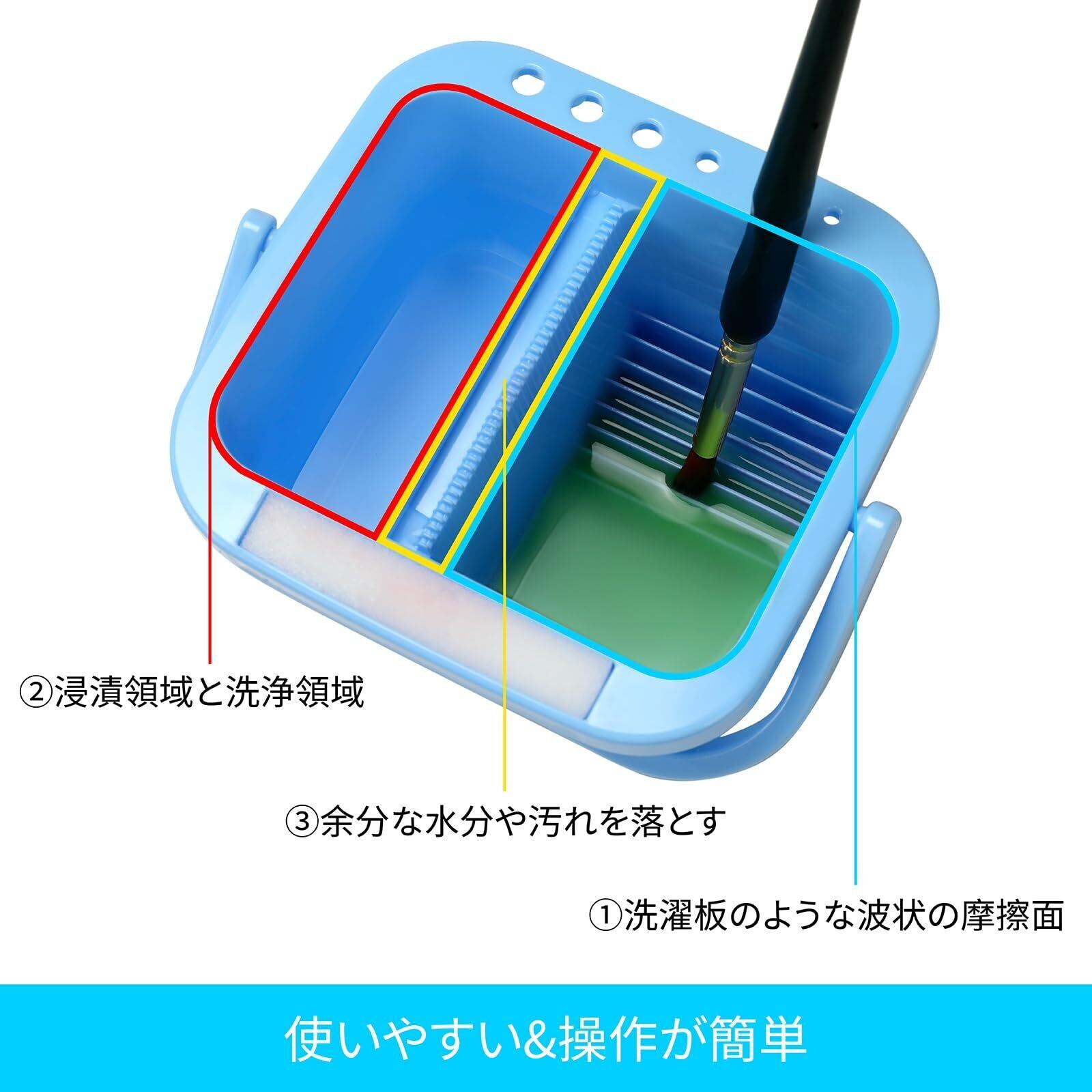 【使いやすい】:この高効率ブラシ洗浄器は、4つの簡単なステップでブラシをきれいに洗えます。① まず、洗濯板のような波状の摩擦面でブラシをこすり、色の塊を落とします。② 準備した水場でもう一度洗い流します。③ ギザギザの摩擦面で余分な水気や汚れをかき取ります。④ スポンジで素早くブラシの水分を吸い取り、側面の丸い筆挿し穴に収納すれば、次回の使用に備えられます。