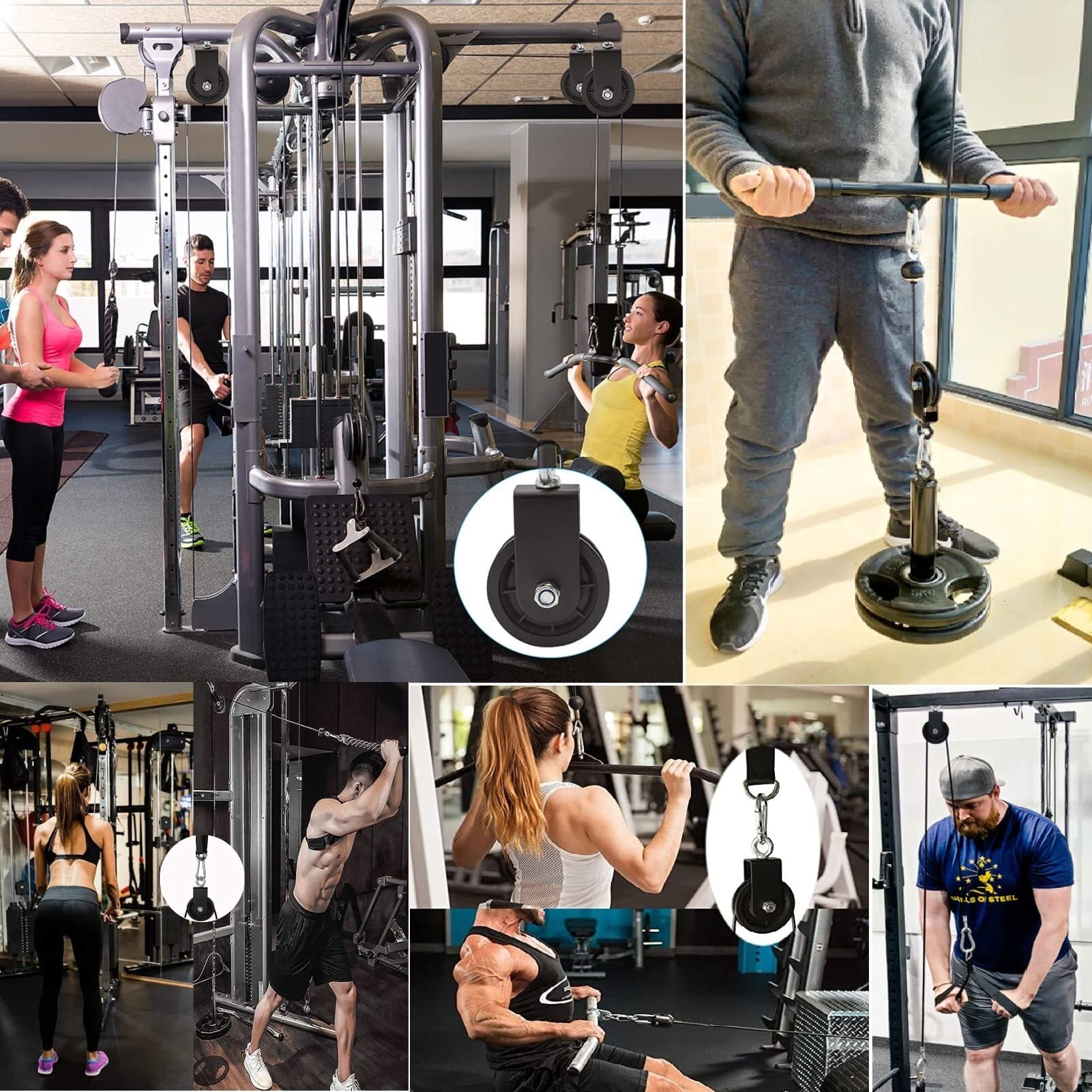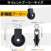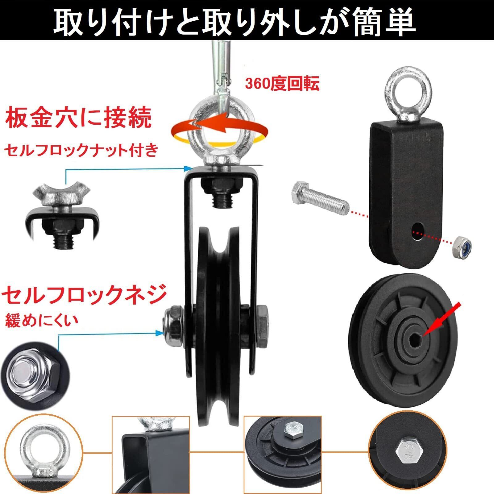 【360度回転】フィットネスプーリーの上部には、回転可能なトップリングが装備されており、セルフロックナットで板金穴に接続されているため、360度自由に回転することができ。ロープの結び目を防ぎ、使いやすい, 滑らかなロープ滑車が優れたロープトラバースを実現。溝巾9mm、最大直径10mmのロープに適用。安全荷重は150kg以内、機能性と耐摩耗性のパフォーマンスがいい。