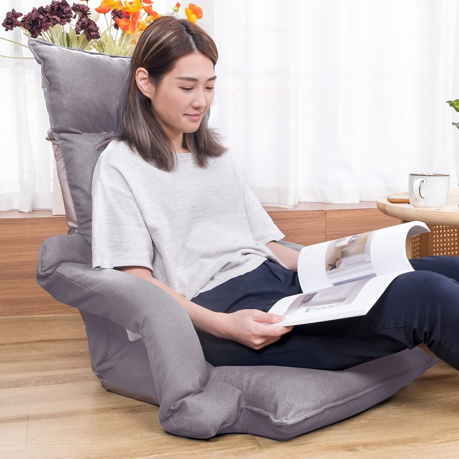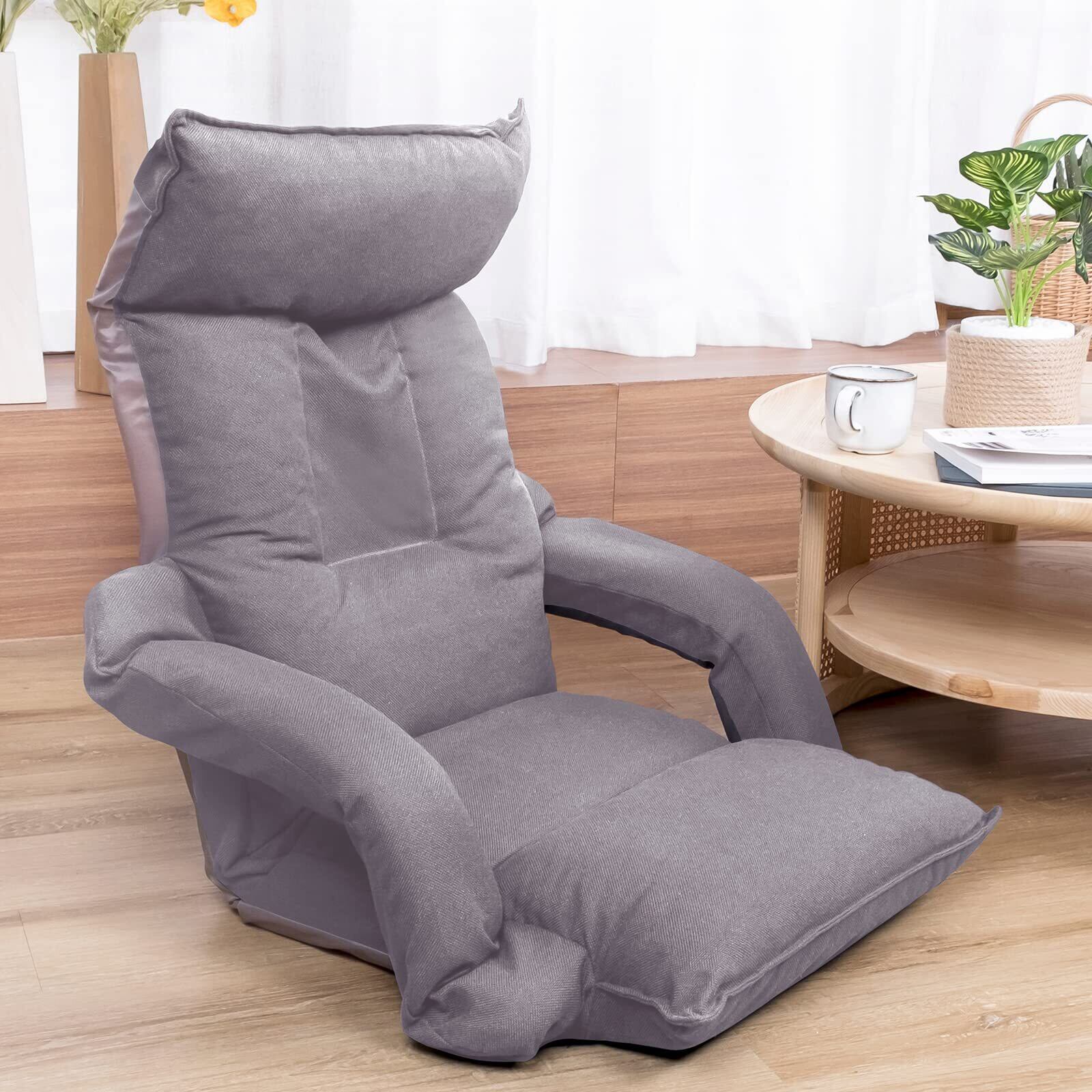 WAVV 座椅子 ひじ掛け付き ハイバック 低反発 背もたれ・頭部 14段階調整 肘掛けリクライニングに連動 1人掛け フロアチェア 座椅子 (麻リネン布 生地, ライトグレー)