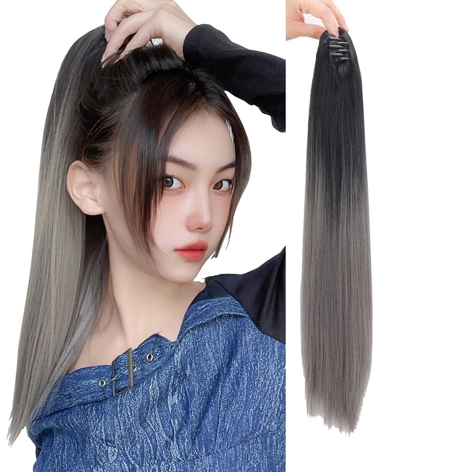 レディース クリップ式 カラフル グラデーション ポニーテール ウィッグ つけ毛 ロング ストレート ヘア エクステ かつら ポイントウィッグ 耐熱(50cm, グレー)