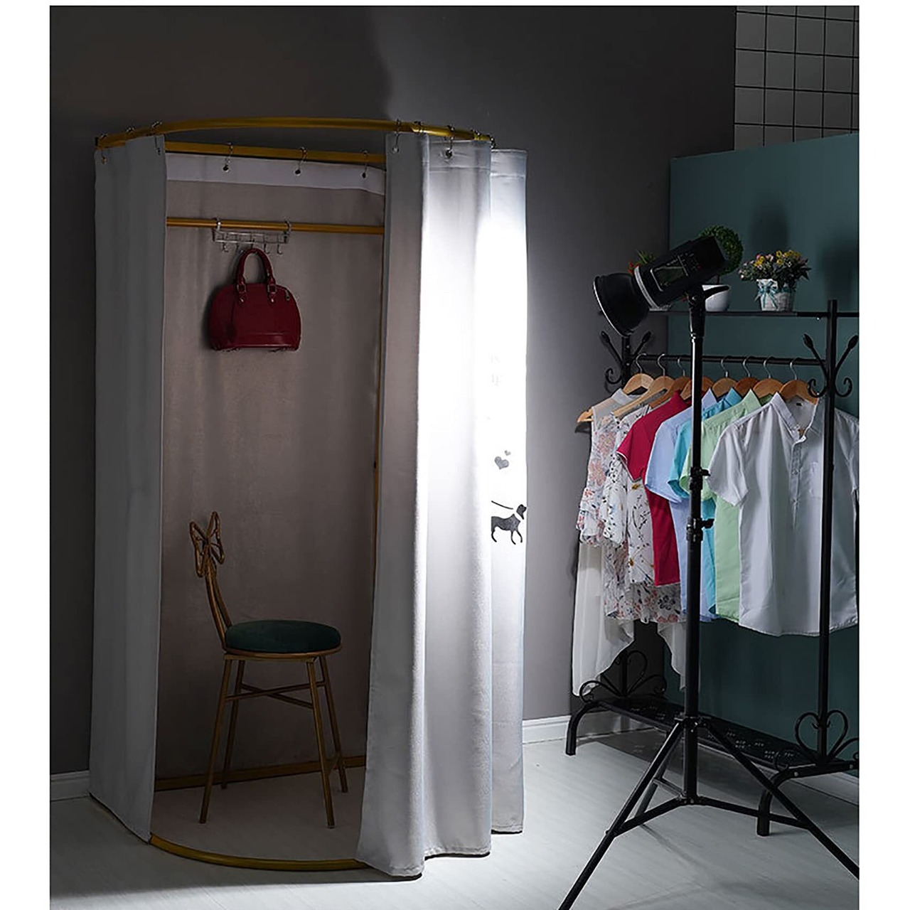 フィッティングルーム :厚めのカーテンですので、プライバシーも守られ安心してご使用いただけます!良質鋼管を採用、安定性が抜群!耐性のあるカーテンタイプ。