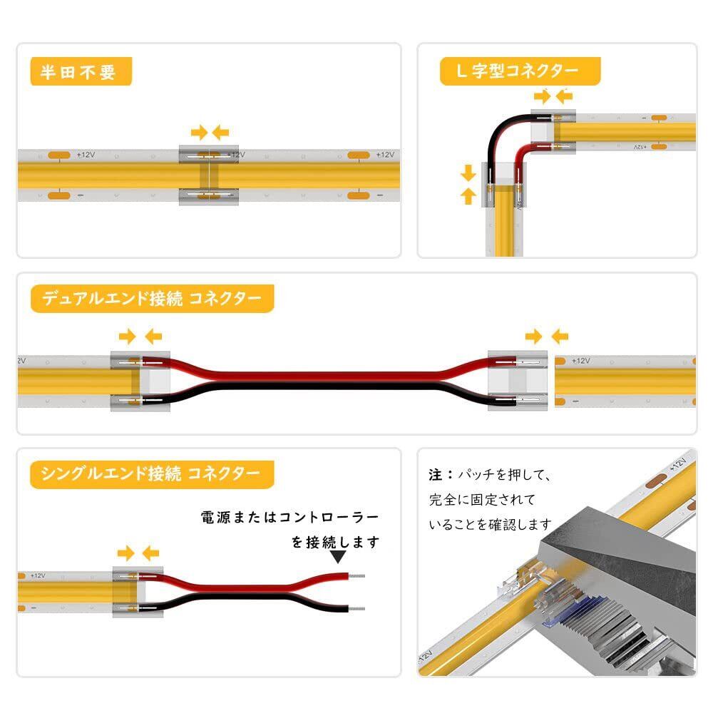 このFCOB LEDコネクタを使用すると、FCOB LEDテープライトを自由に切断できます。これらのアクセサリを使用すると、テープライトを延長して接続したり、テープライトとコントローラーまたは電源の間の接続を延長したり、コーナー接続を実現したりできます。