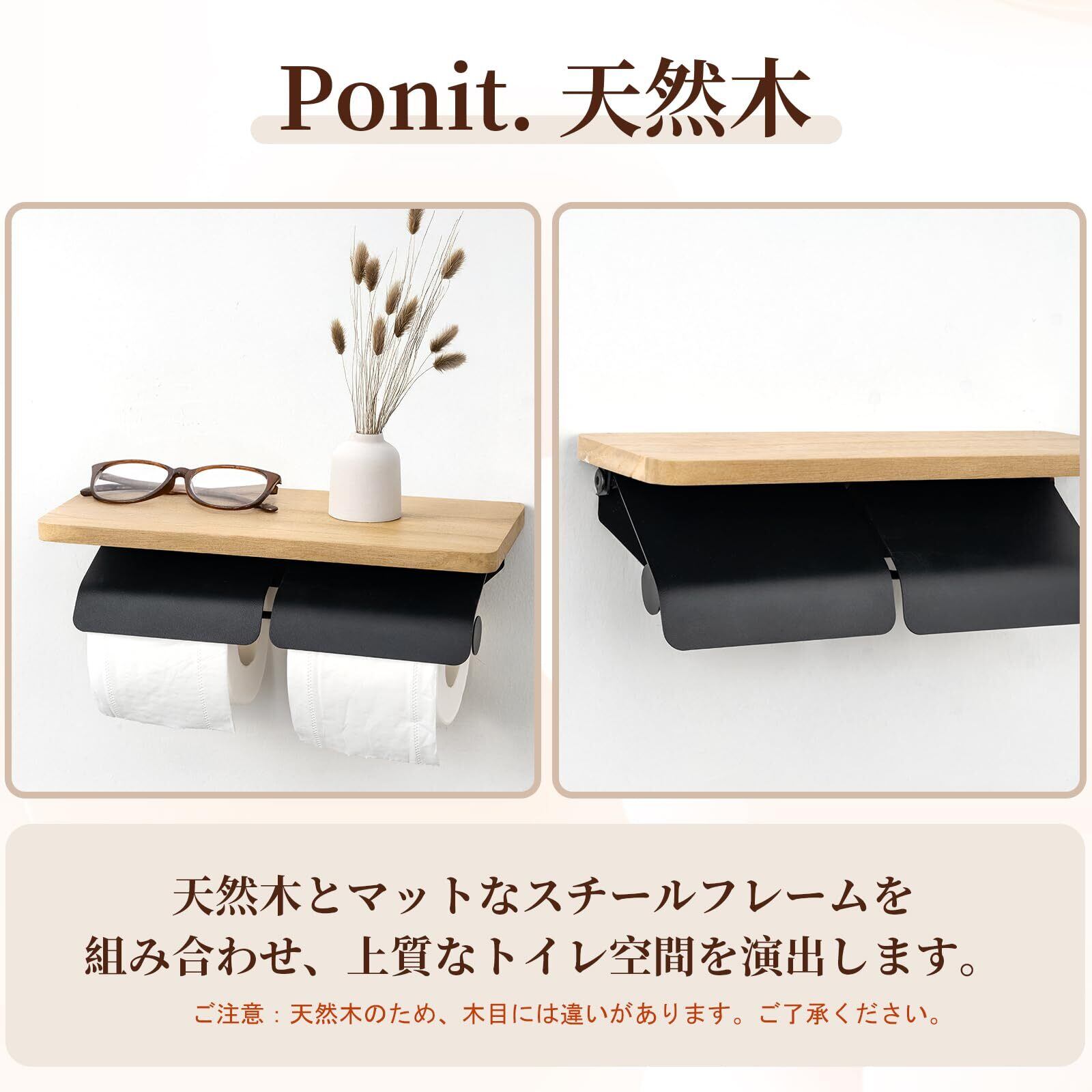 トイレットペーパーホルダー 木製 棚付き スマホ置き インテリア 賃貸 DIY おしゃれ 2連 簡単設置 補充楽 飾り棚 ペーパーホルダー 収納対応紙巻器(ナチュラル×ブラック ダブル) | Bloomia