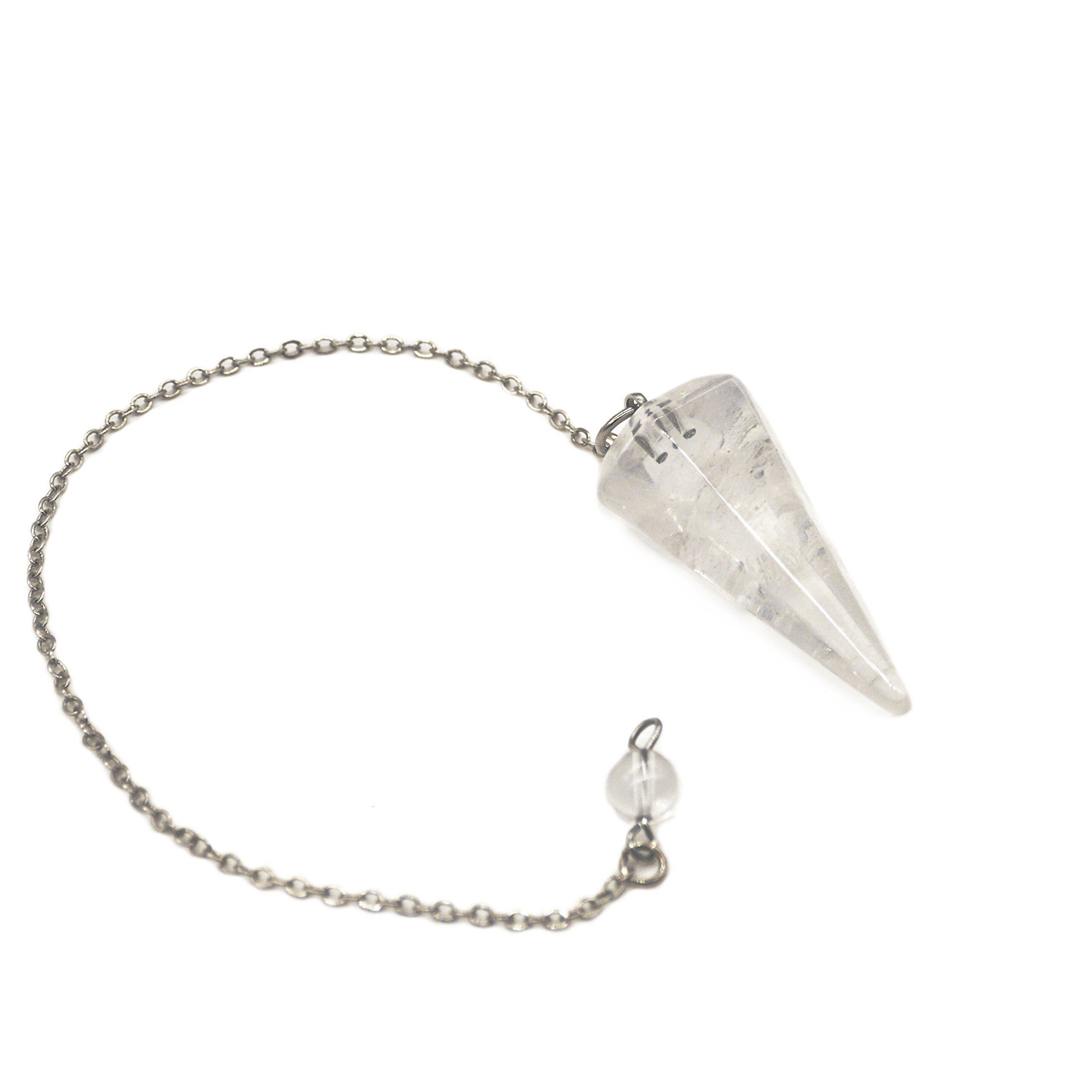 天然石パワーストーン ペンデュラム振り子、 ダウジング風水占い用、 天然水晶透明クォーツ製、ヒーリングストーン チャウラストーン六角錐 6面カット、金属チェーン付き