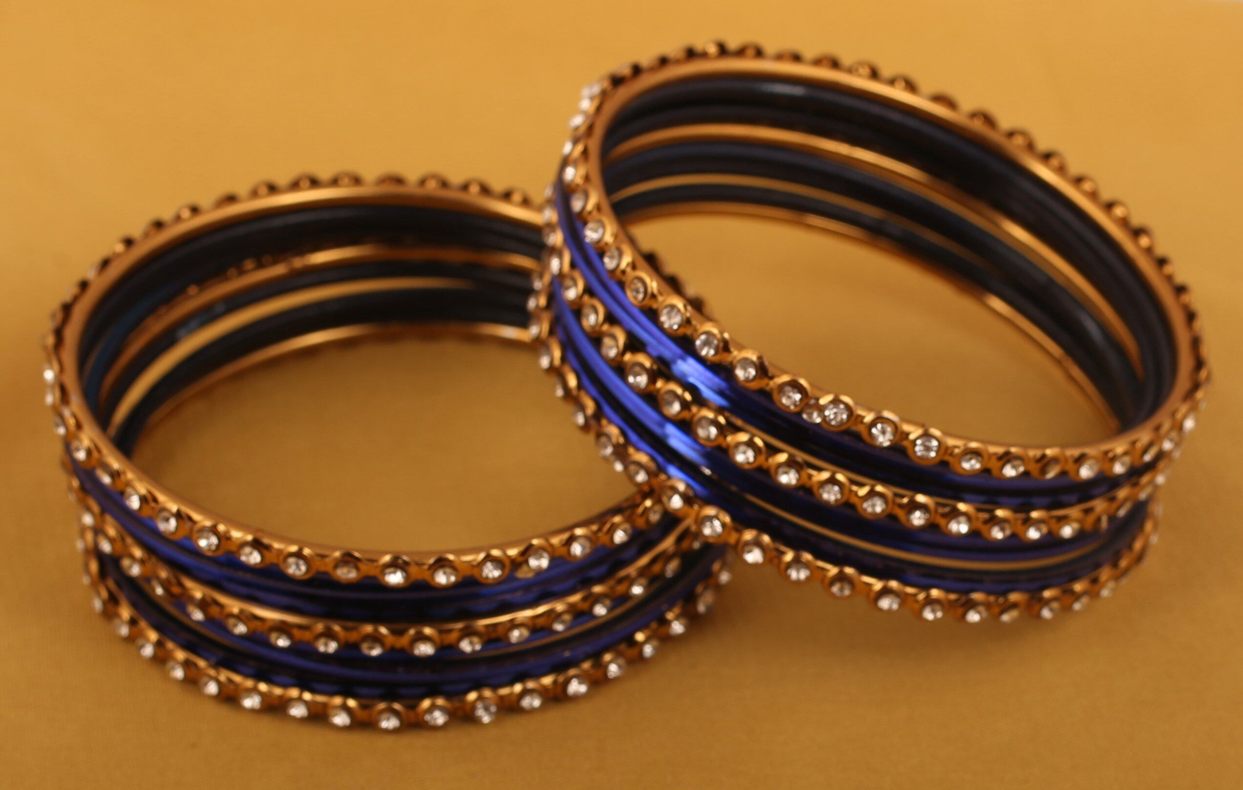 Touchstone「カラフルバングルコレクション」インドボリウッド合金メタルとテクスチャードロイヤルブルーデザイナージュエリーバングルブレスレット。 18個セット。 女性用アンティークゴールドトーン。 サイズ:M~L インディアン2-8。 内径2.5インチまたは6.35cm。 がっかりしないように、注文前に古いバングルと一緒に確認してください。